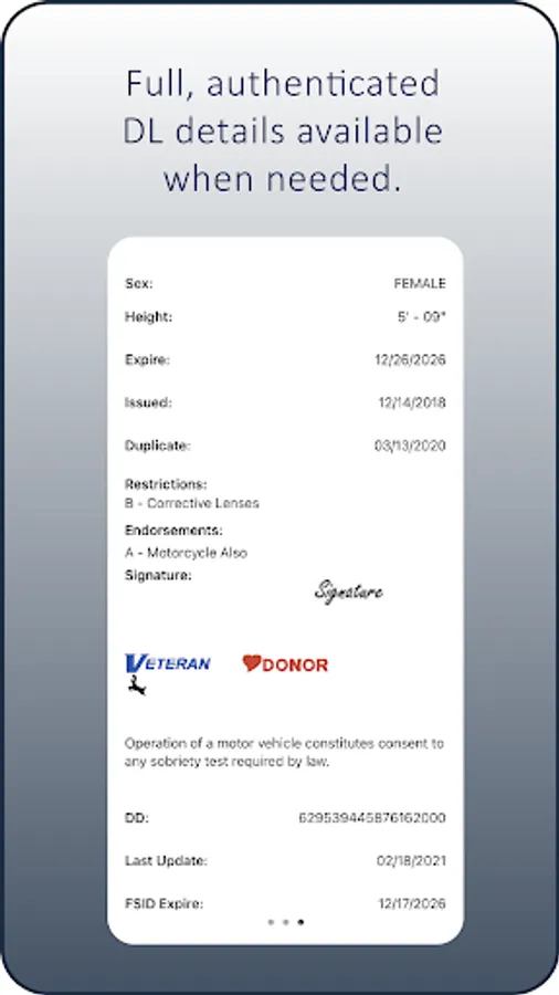 Florida Smart ID LE Verifier by Thales provides only the information necessary to each verification situation. In the case of a Law Enforcement officer verifying a citizen’s identity and/or driving privileges, the officer will typically be presented with the same information available on the citizen’s physical driver license – but with the immediate assurance that the credential is current, valid and authentic.