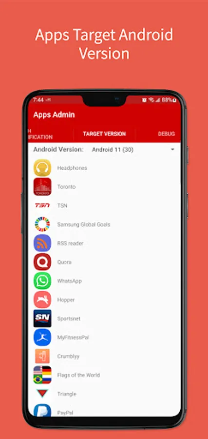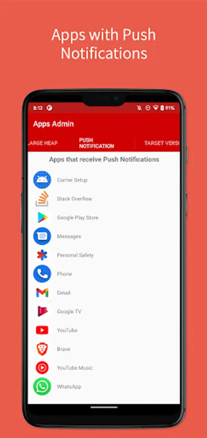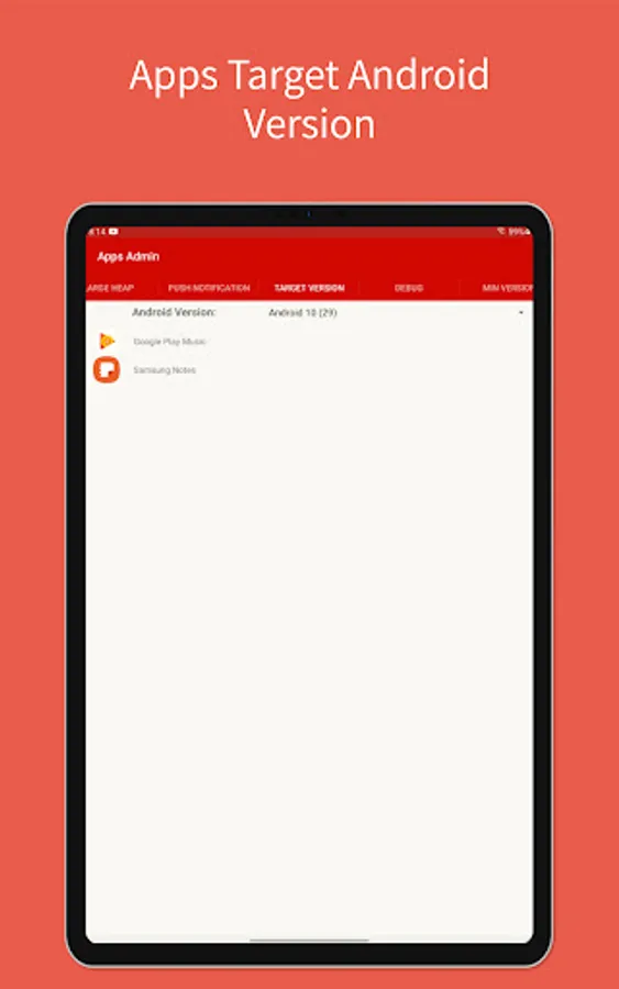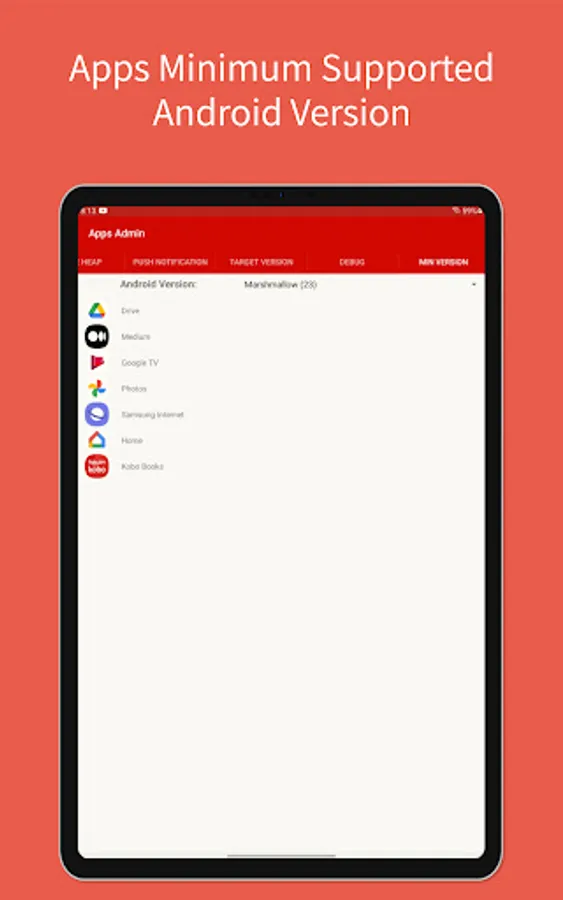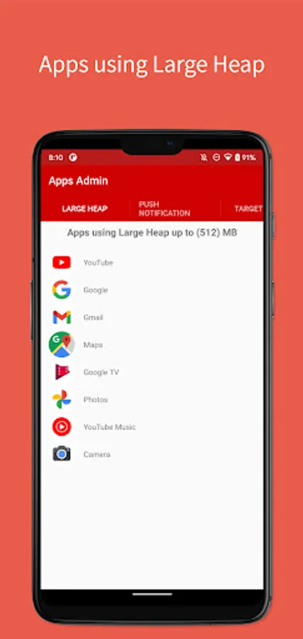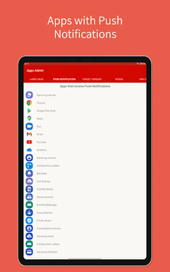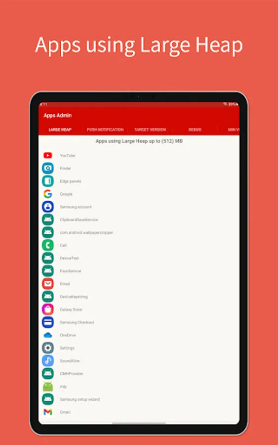 An admin app to monitor status of installed applications. It lists apps using large heap, supporting push notifications, target android version and minimum supported Android version.
