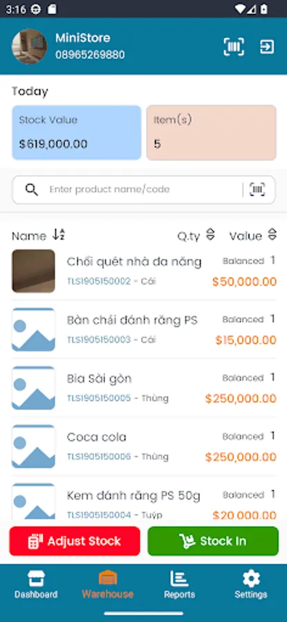 miniPOS tích hợp tính năng kiểm kê đơn giản, giúp bạn nắm thông tin về số lượng tồn kho của từng sản phẩm, giúp bạn đối chiếu với số lượng thực tế và điều chỉnh nếu cần.