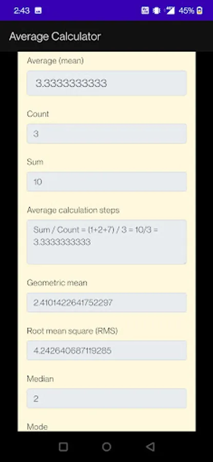 Along with the average, this average calculator also offers a Count of the numbers, steps of how to calculate the average, Geometric mean, Root mean square (RMS), Median, mode, sample id, range, the minimum value on the set, and maximum value on the set.