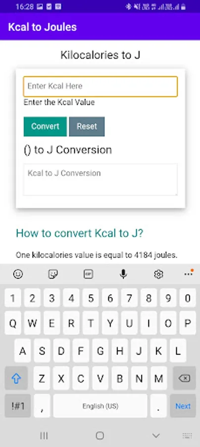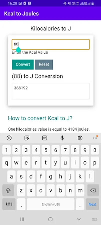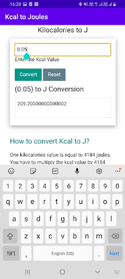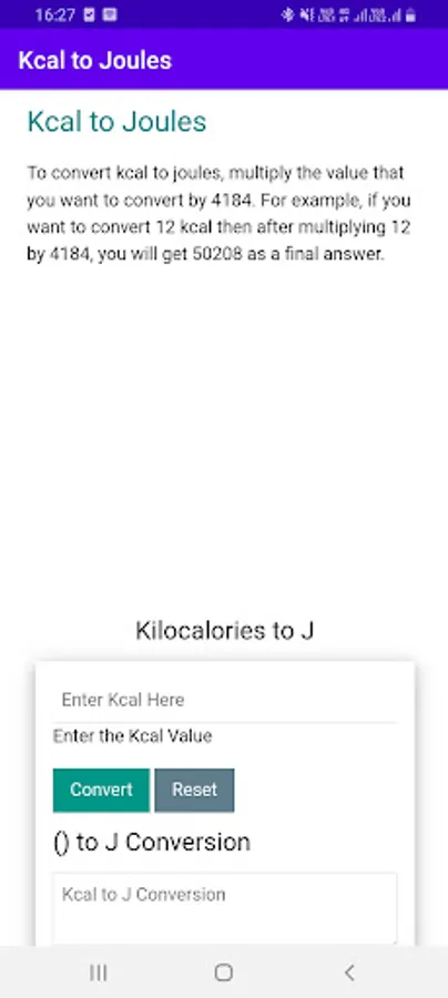 Once you tap on the convert button, this app will convert kcal to joules and return the final answer in Joules value.
