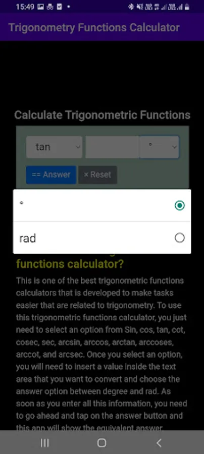To use this Trigonometry Functions Calculator, you just select a value from sine, cosine, tangent, cot, sec, cosec, inverse sine, inverse cosine, and inverse tan from the select options tab. Once you select an option, you get to insert a value inside of the value box and tap on the convert button. Once you tap on the button, this Trigonometry Functions Calculator will show the correct answer for the value you have entered.