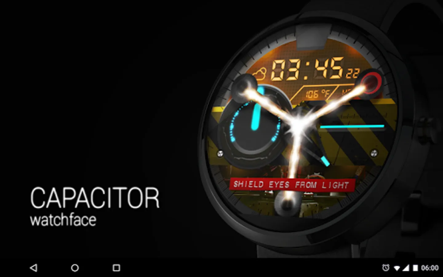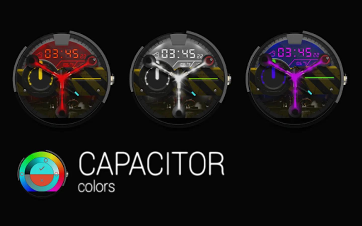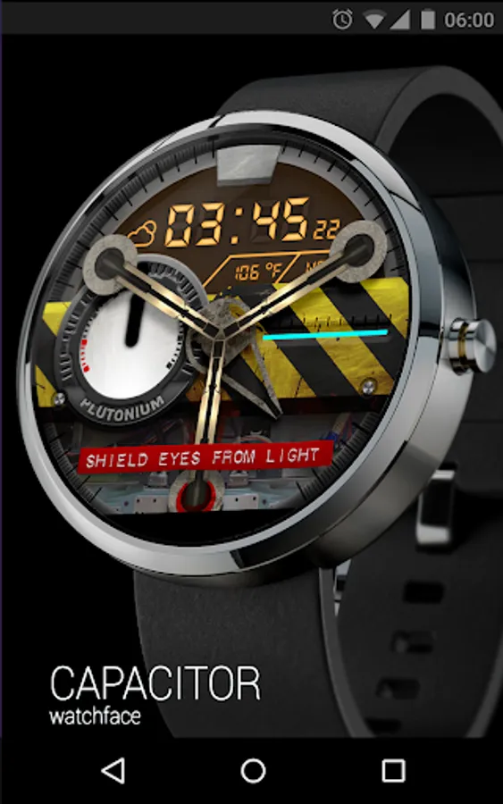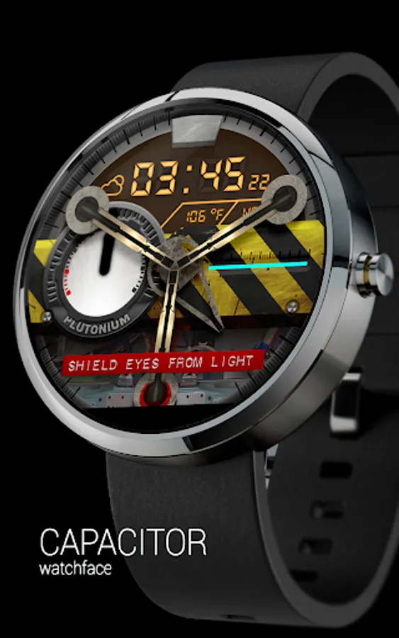 CAPACITOR is a modern digital and analog watch face for Android Wear. This portable flux capacitor was made when i came back from the future and couldn't find where the Delorean was parked. This watch face can be hard to tell time on but its the only one that makes you time travel ...if you can run 88 Mph of course.
