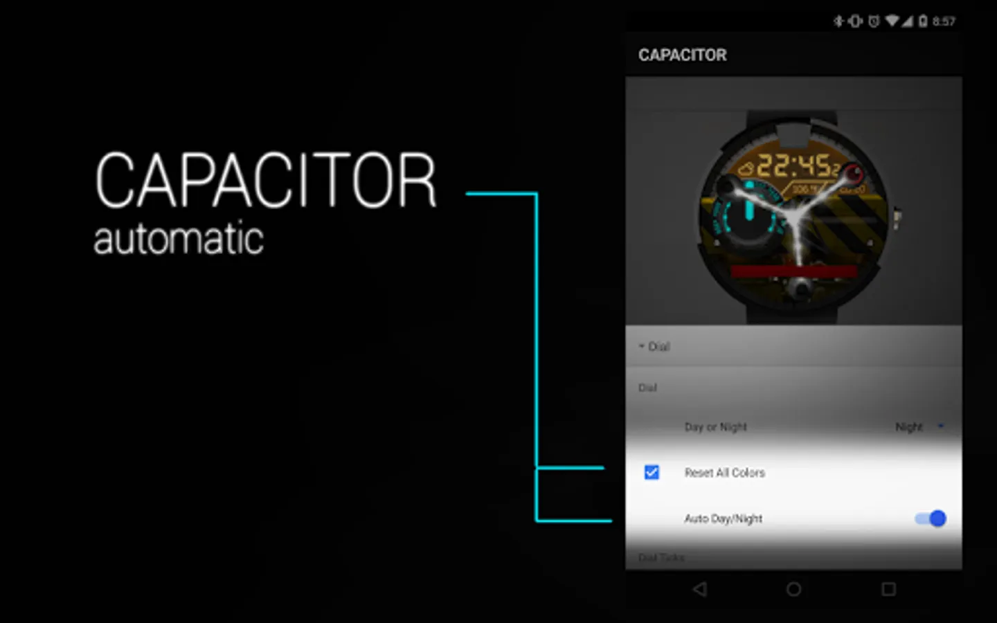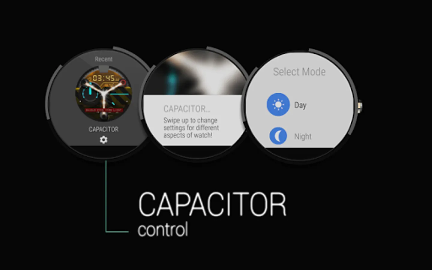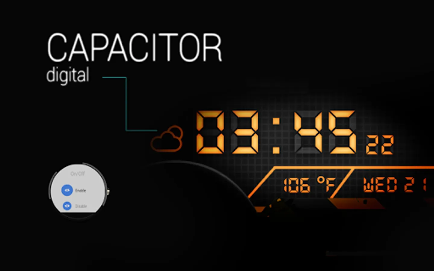 CAPACITOR is a modern digital and analog watch face for Android Wear. This portable flux capacitor was made when i came back from the future and couldn't find where the Delorean was parked. This watch face can be hard to tell time on but its the only one that makes you time travel ...if you can run 88 Mph of course.
