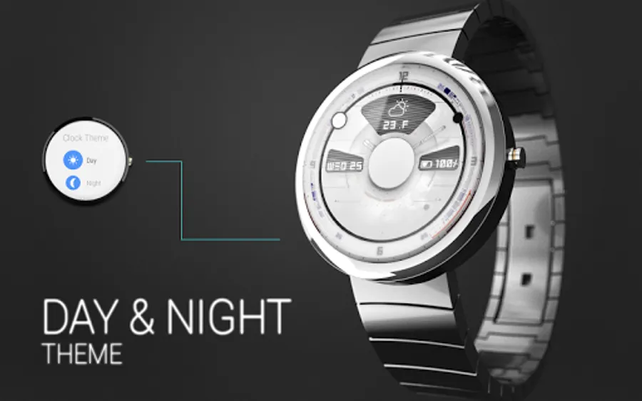 Futuristic Interface with many settings and a clean look. The customization options are accessible by long pressing the watch face, or directly from the Android Wear app.