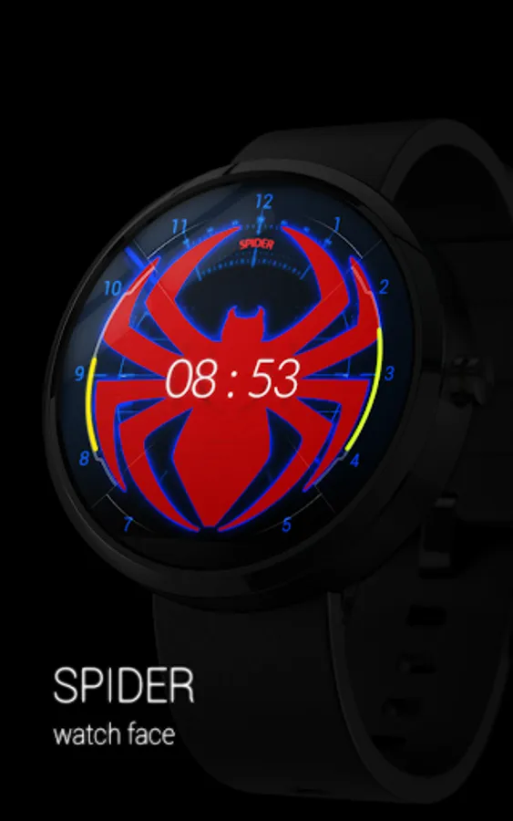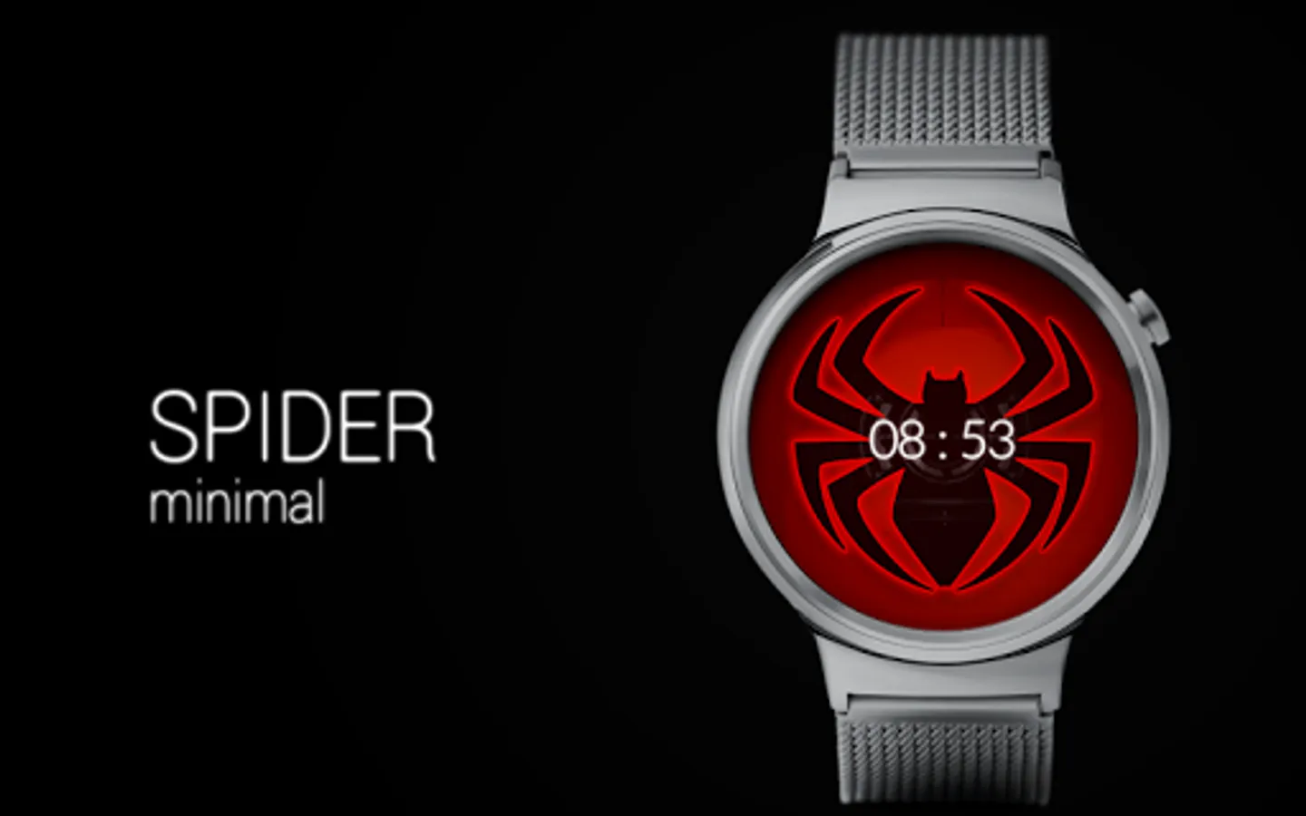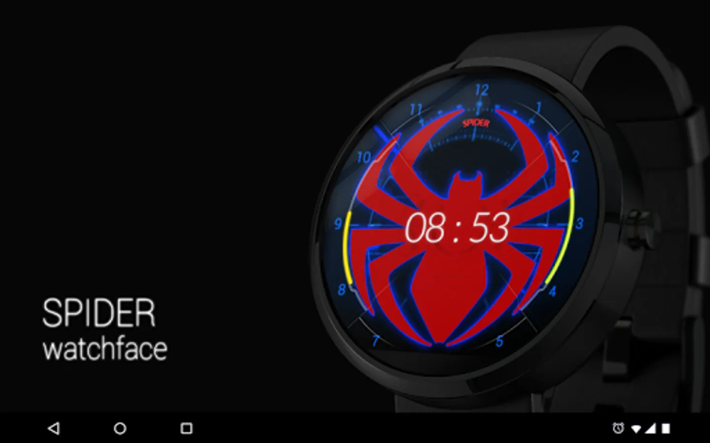 Tha SPIDER is a modern digital and analog watch face for Android Wear, it does not fire an adhesive "webbing" or special synthetic polymer adhesive that has spider web-like properties. But it does emit "time" to enhance your spider-sense.