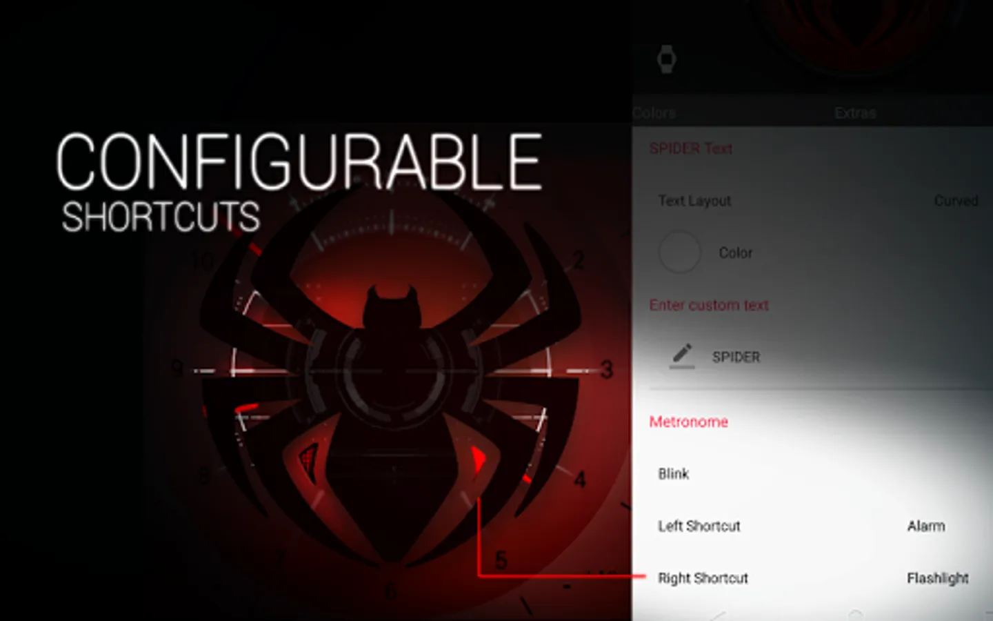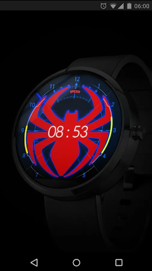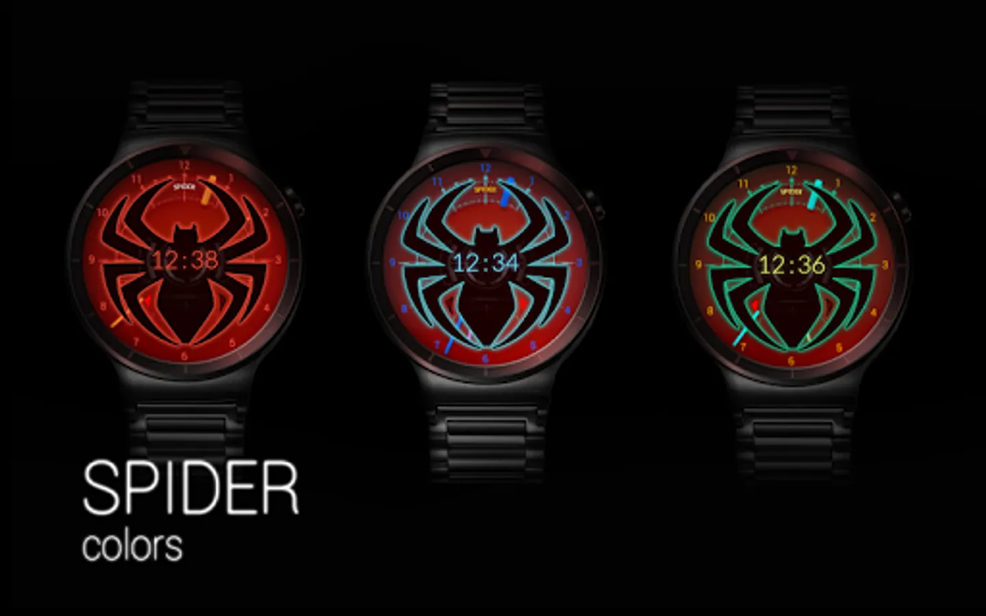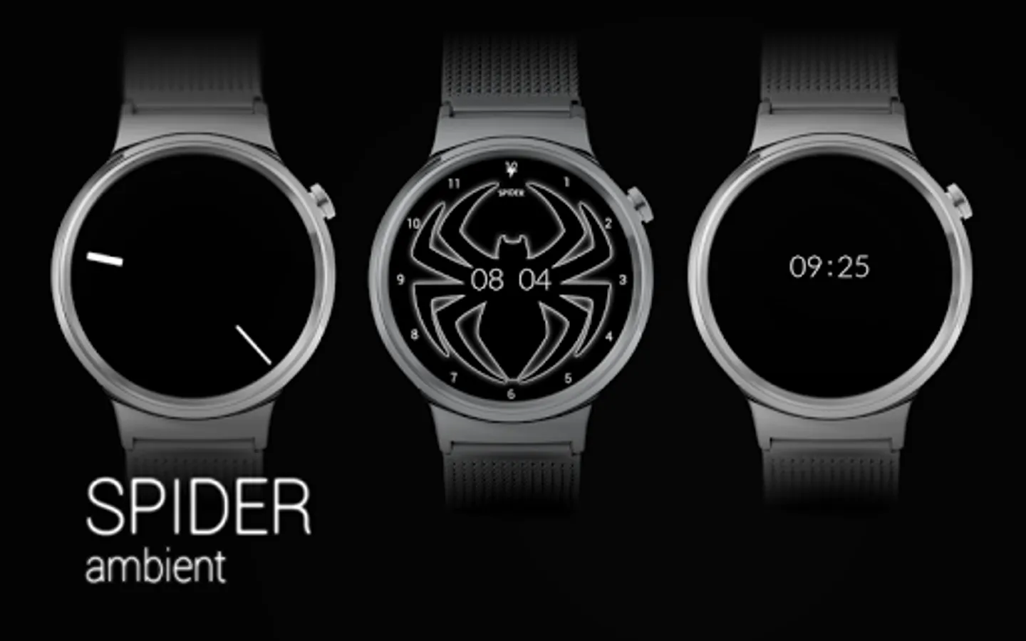 Tha SPIDER is a modern digital and analog watch face for Android Wear, it does not fire an adhesive "webbing" or special synthetic polymer adhesive that has spider web-like properties. But it does emit "time" to enhance your spider-sense.