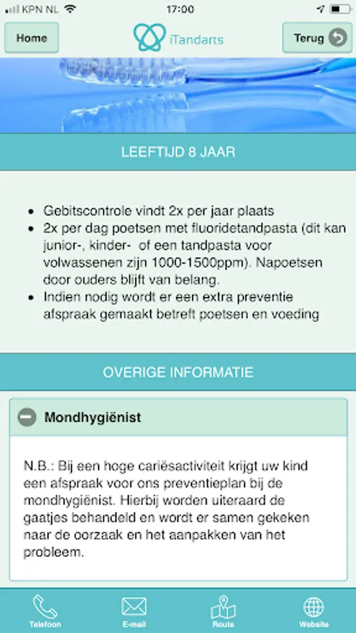 Nowadays, a very large part of the information is provided via a mobile telephone. We want to respond to this with iTandarts. The iTandarts app provides insight into practice, employees and their specializations in a simple and well-arranged way. In addition, the app provides insight into all other matters that are important to you as a patient and useful to know. These items can be found below: