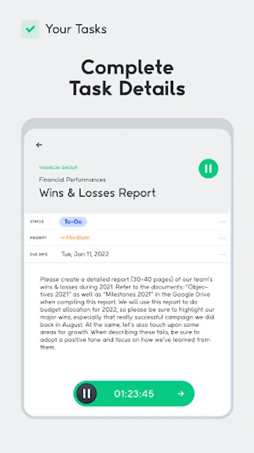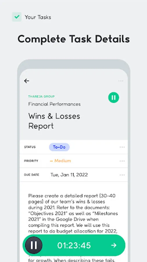 Open Thareja Time Tracker, select the project & task you’re working on and tap Start. The tracker will keep running in the background along with recording time and location. Whenever you need a break or are just done with the work, press Stop. That’s all it requires.