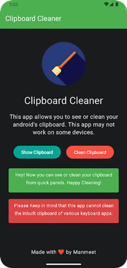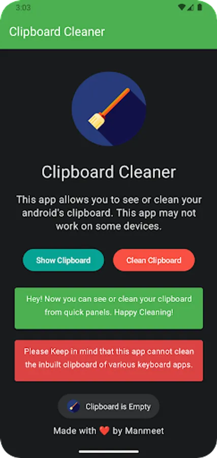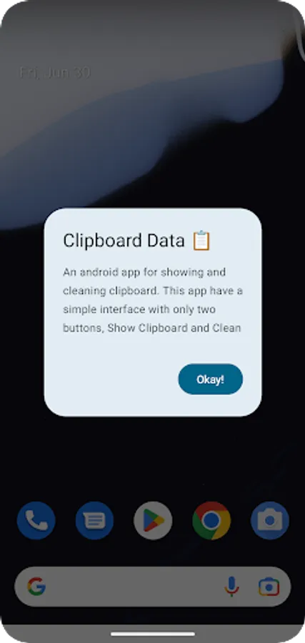 An android app for showing and cleaning clipboard. This app have a simple interface with only two buttons, Show Clipboard and Clean Clipboard. Both shows a small message (Toast) at the bottom with one showing the last copied text in clipboard while other clears the clipboard completely.