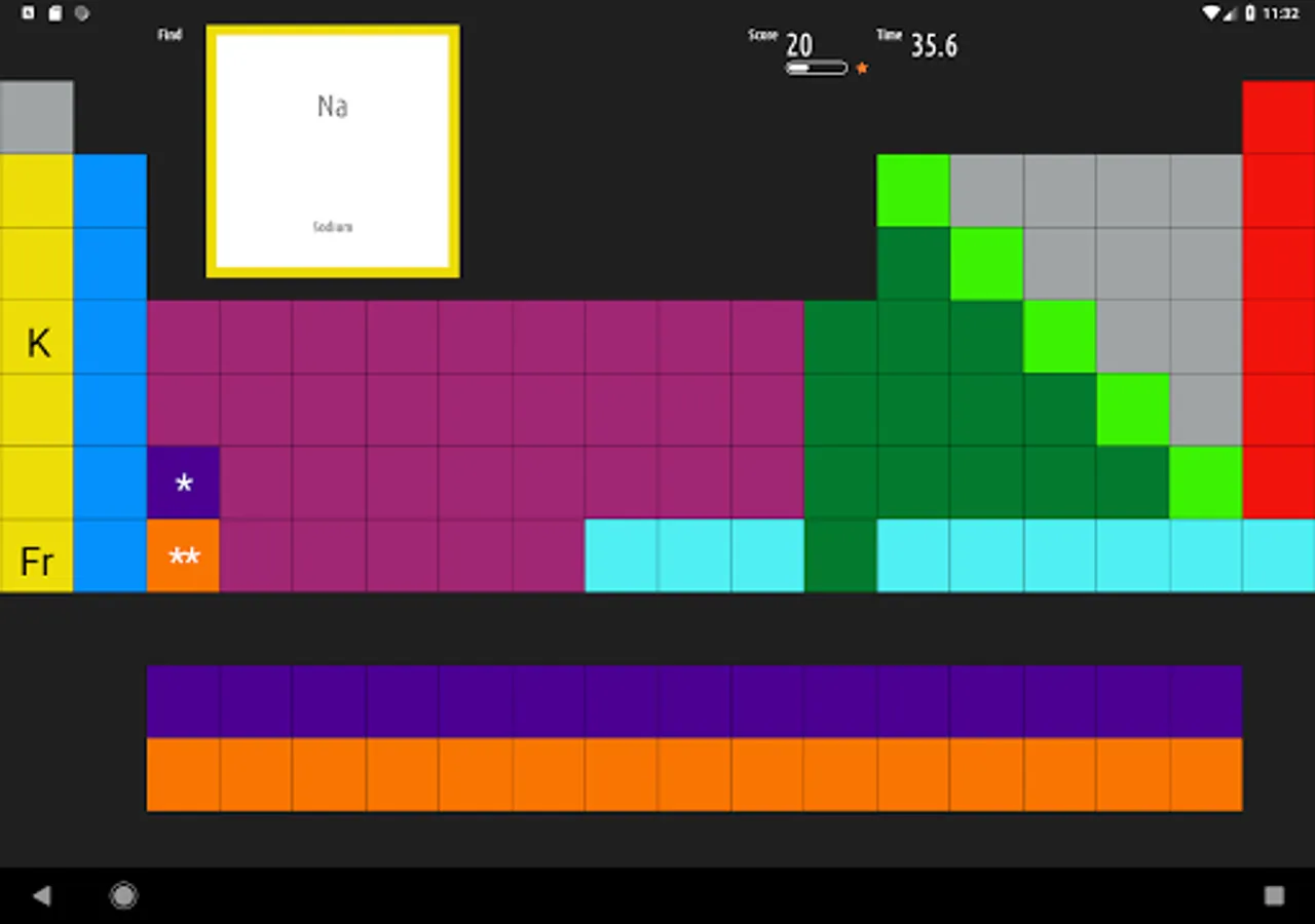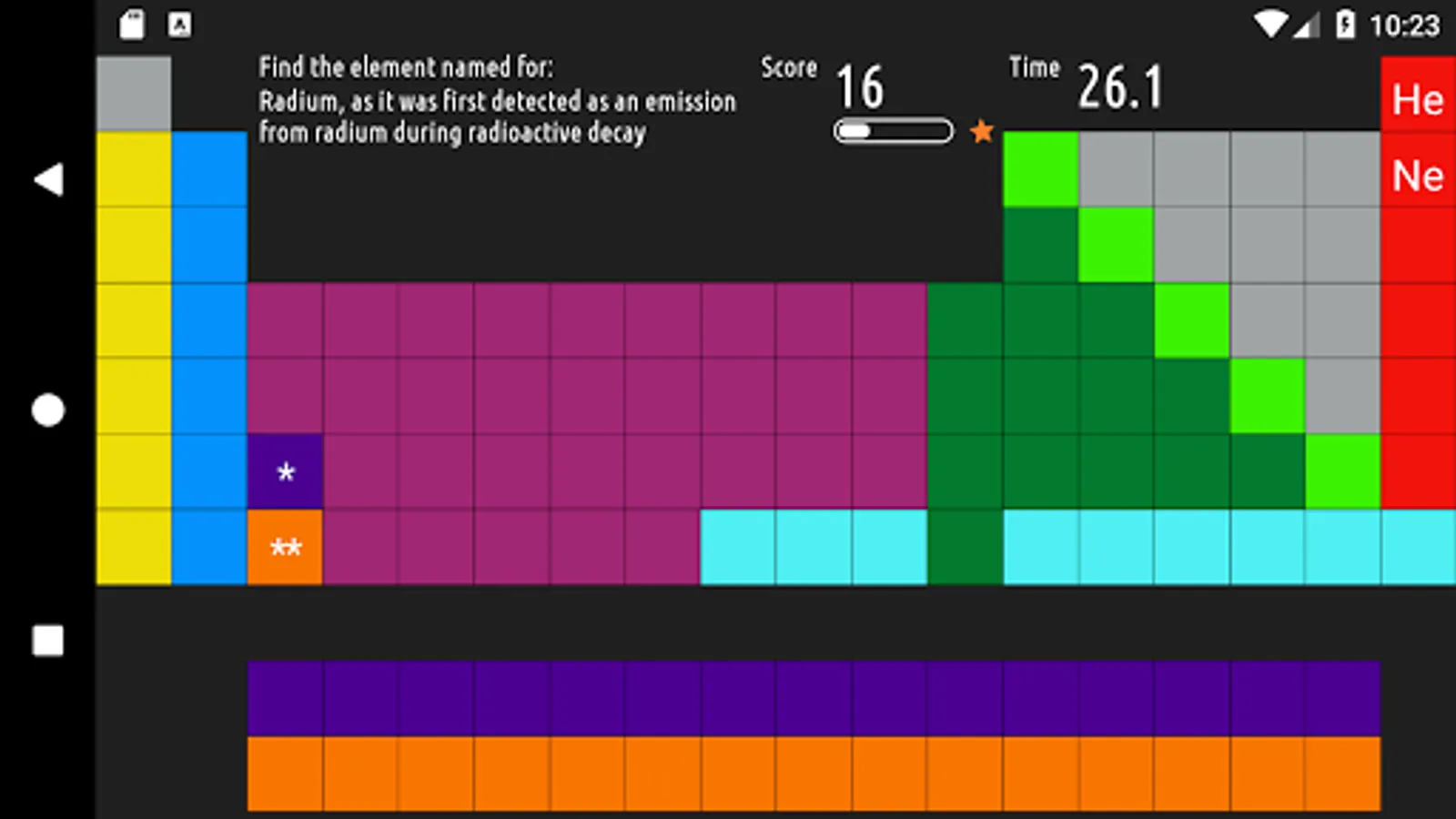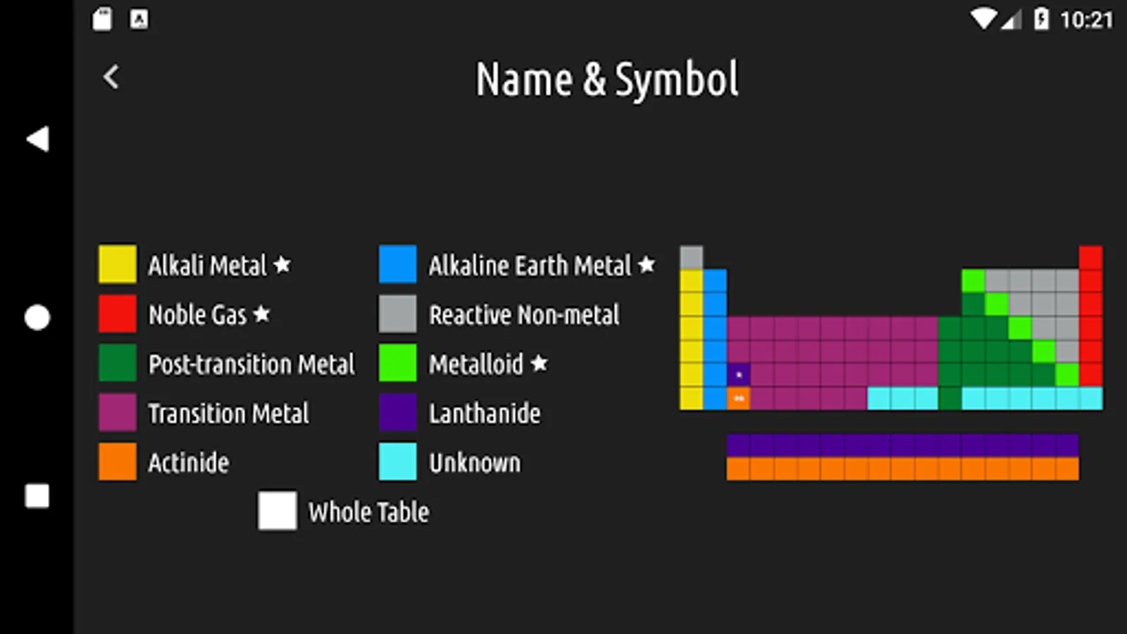 All quizzes are split into 10 categories: Alkali metals, alkaline earth metals, reactive non-metals, transition metals, lanthanides, actinides, post-transition metals, metalloids, noble gases, and unknown.
