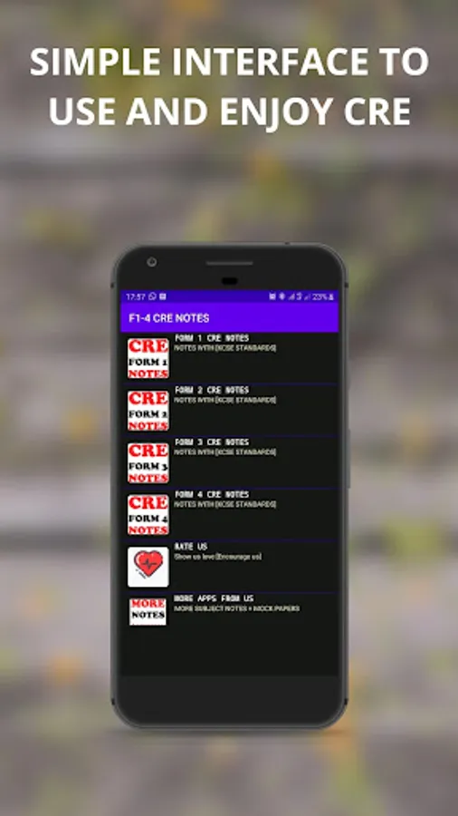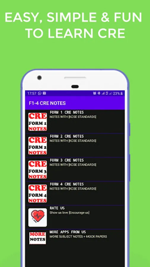The notes include form one notes that form four can go back to read if they have forgotten any concept they had previously learnt and the form ones can use this notes to check what is ahead and as a result they can fully prepare for form one form two ,and form three and form four cre notes ,concepts and facts