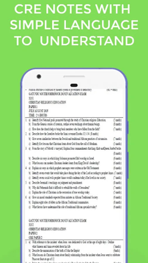 Get cre notes from form one to form four ,cre notes that truly bring to perspective kcse exams in a way that is simple to understand and interpret, this notes have used a language that is usually many times used by kcse examiners hence when teachers and students ude this cre notes for thier revision they are truly a 100% preparing for their kcse examination in each and evry possible their is to revise for cre exams