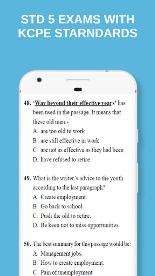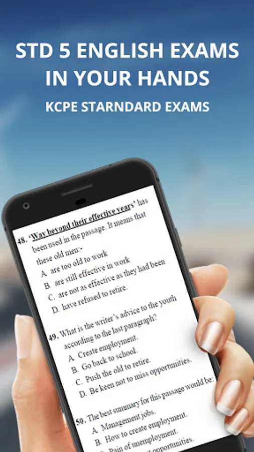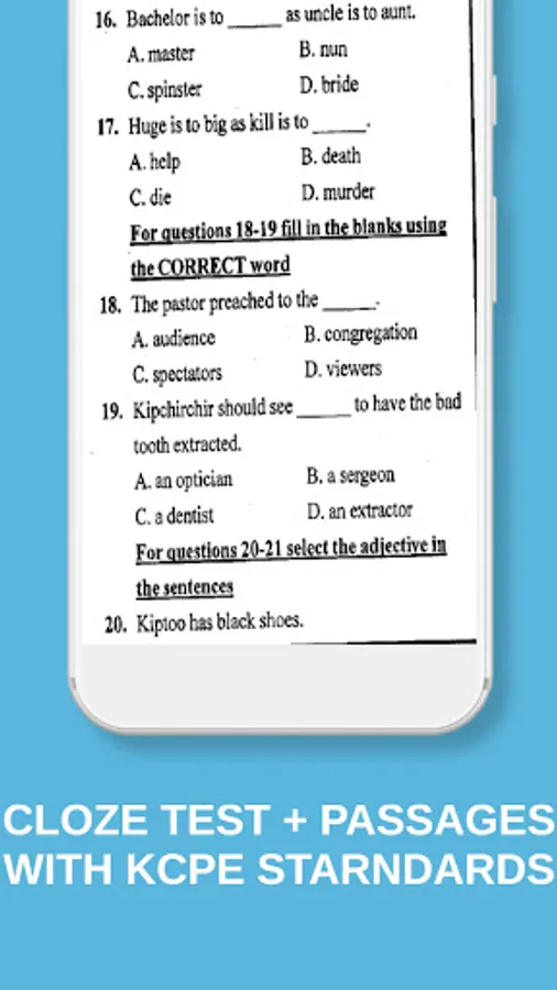 get std 5 english exams that are of kcpe standards and that have used the kcpe structure of setting exams and the mode of asking questions and answer structure also reflects the kcpe exams so that std 5 students can have a feel of quality and quantitative english exams are done and as a result preparing teachers and students for the unforeseen difficult circumstances that are often experienced when tackling english kcpe exams