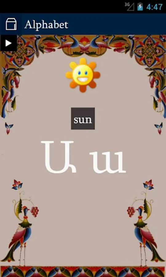 User can hear the pronunciation of each Armenian letter, with an example for a word and the image. After you listen every letter you and your kid will be able to test themselves.