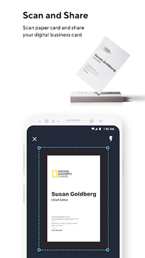 Build a digital business card right in the app for less than 1 minute or digitize a printed one