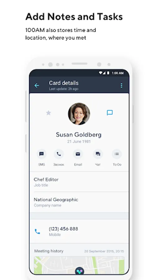 100AM meeting history, time, notes taken during the meeting - never forget, where you met this person.