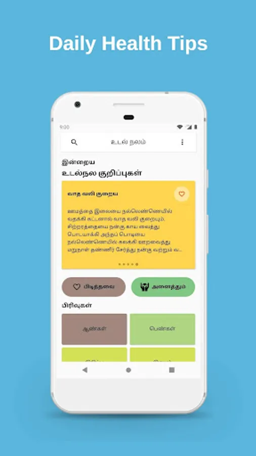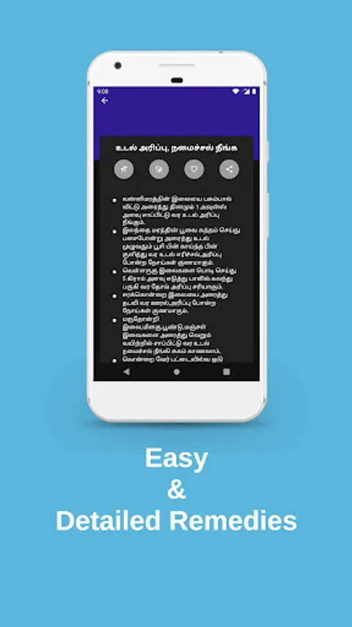 This App Provides Health Tips and Remedies, Home Medicine or Paatti (Patti) Vaithiyam, Tamil Medicine, Nattu Maruthuvam, Nattu Vaithiyam, Handbook, Health Remedies, Siddha Medicine or Siddha (Sidha) marutthuvam, Food Habits and Diets (Unave Marunthu) to follow to cure diseases in Tamil font.