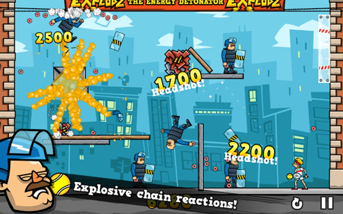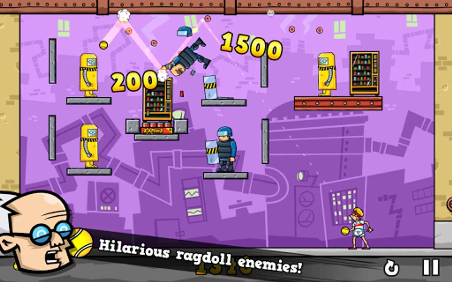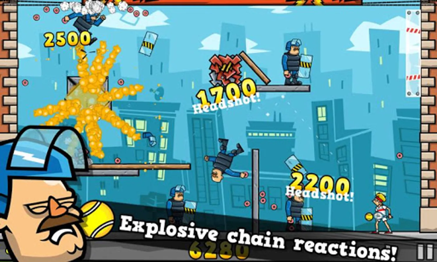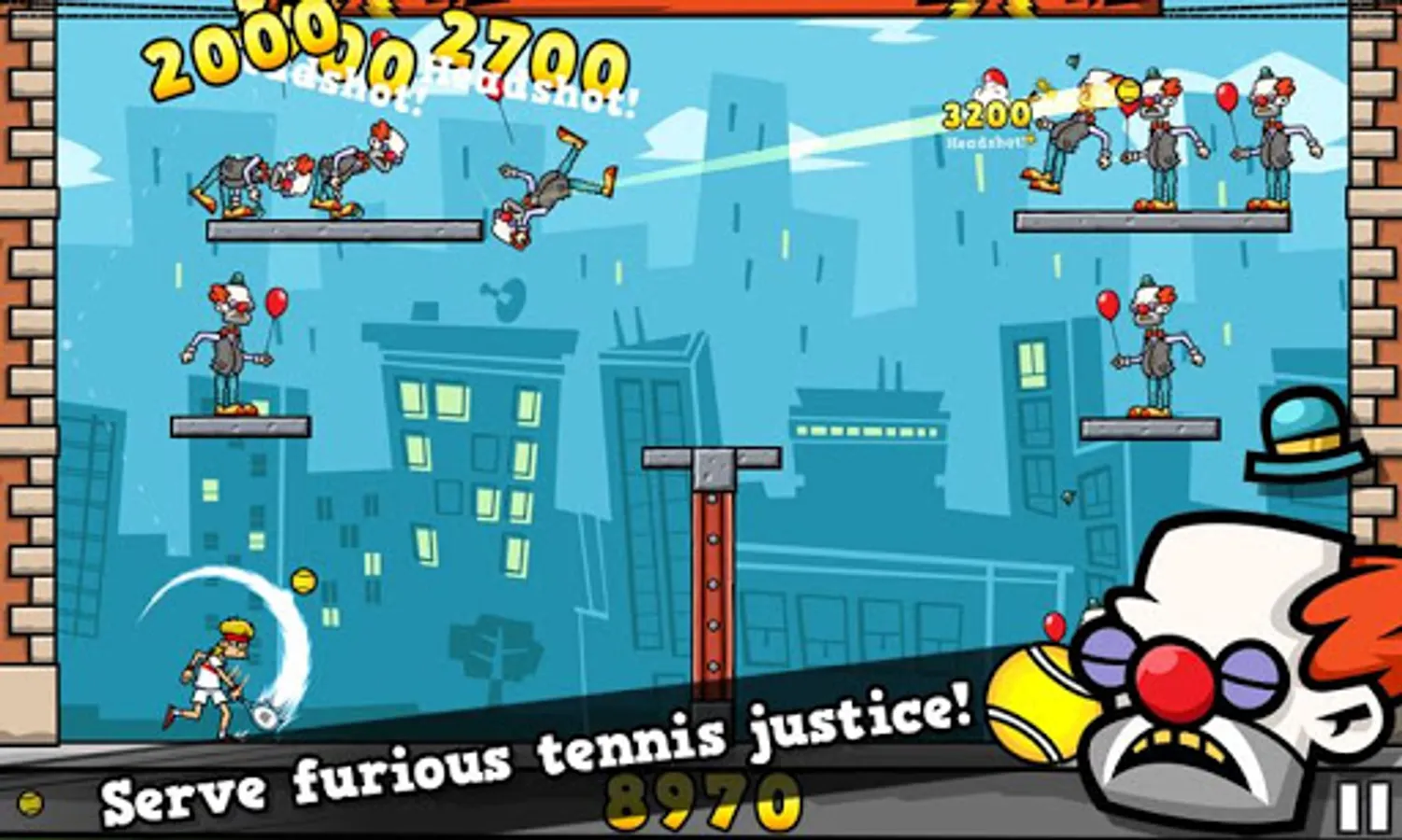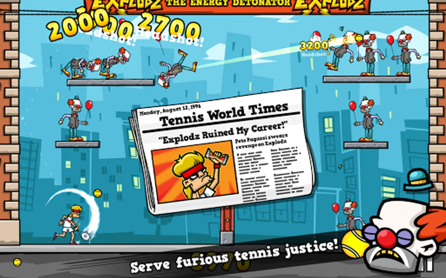 Help Pete Pagassi to save the city from an evil energy drink corporation Explodz. Knock out creepy clowns, evil riot police and other Explodz-addicted maniacs with a tennis ball in the face. Bounce the ball off walls to reach targets lurking in cover and watch them tumble hilariously. Trigger masterful chain reactions and watch the chaos unfold. Finally enjoy the level finale in slow motion!