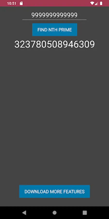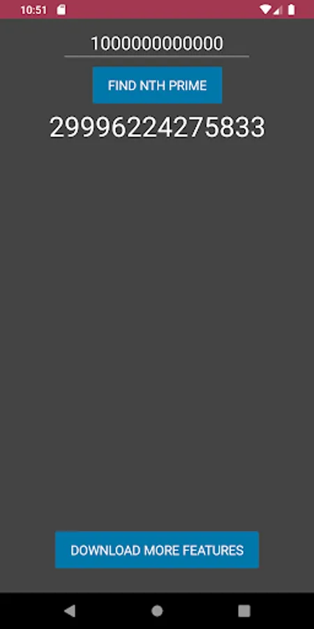 This app finds the nth prime in seconds or less depending on the size of the input. For instance, inputting a 10 would give the 10th prime. This app can receive an input as large as 9,999,999,999,999 (1 less than 10 trillion). Even the largest of inputs should only take seconds.