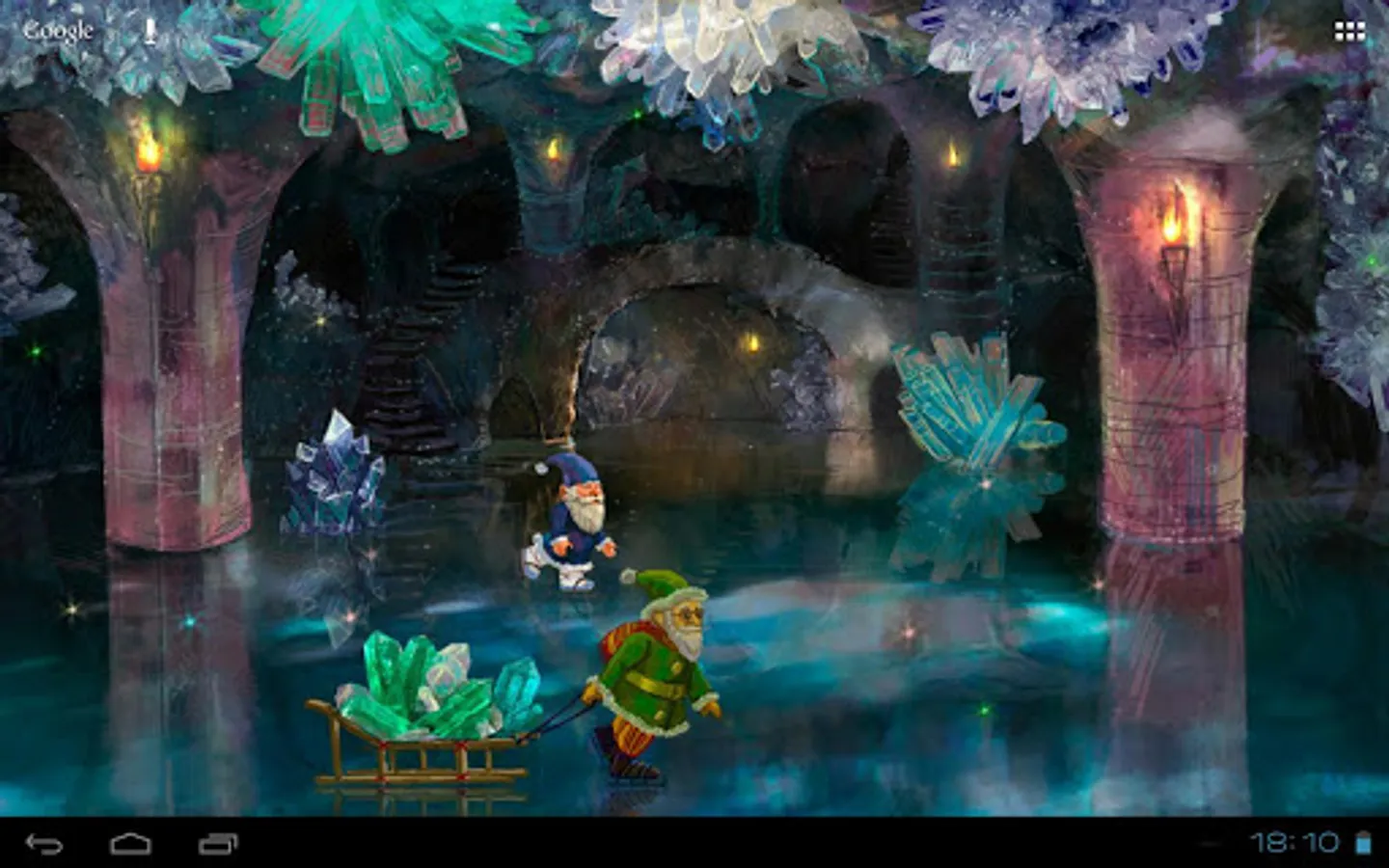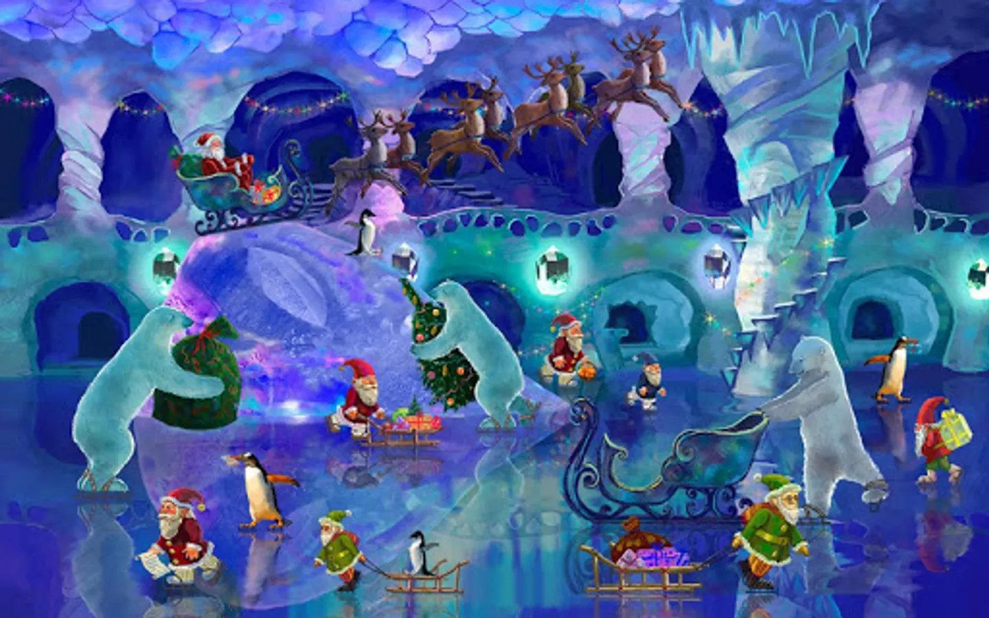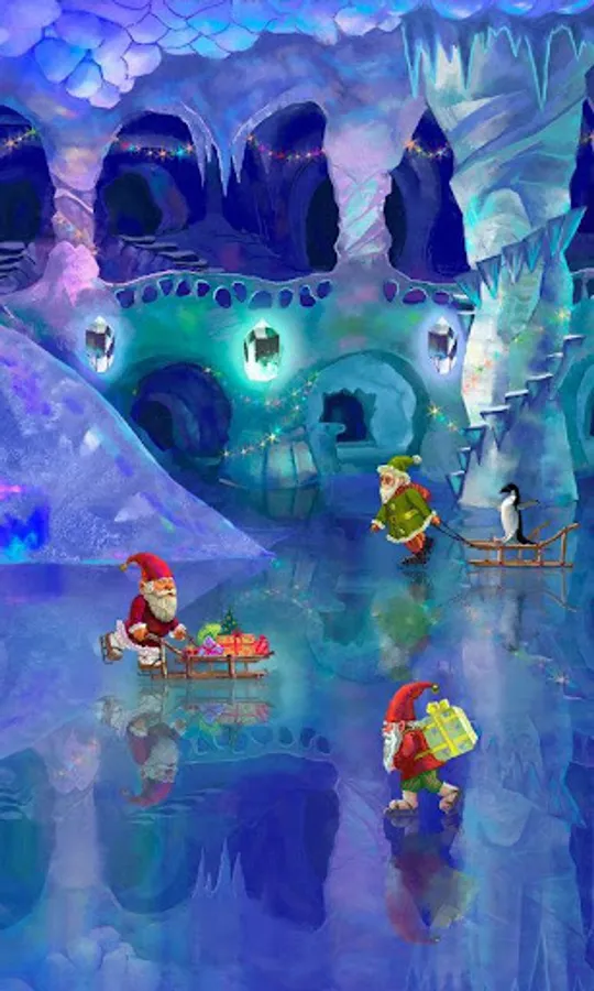 Deep underground there is a secret cave full of fabulous gnomes that mine treasures and precious gems to handcraft gifts of the highest quality. They gracefully slide on ice surface of the cave.