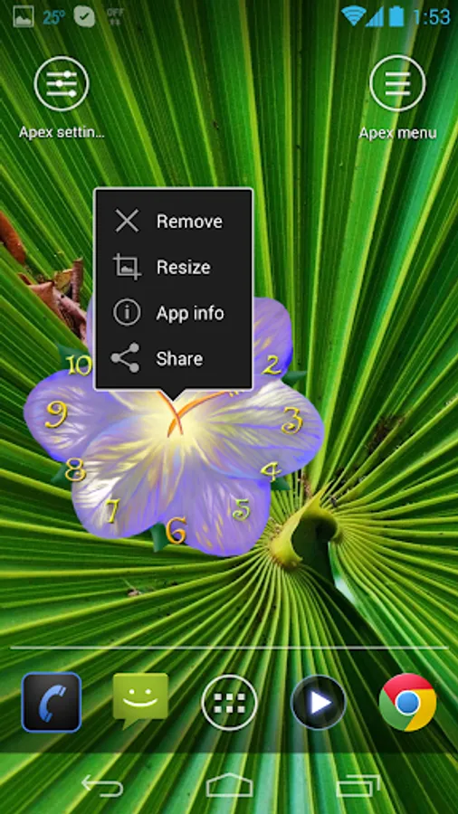 You can resize Serene flower clock widget as you like in many launchers like Nova Launcher, Apex Launcher etc. Just put it to your home screen and long tap on it and select resize in menu. You can make Serene flower clock really big or tiny if you want. The default size is average 2x2.