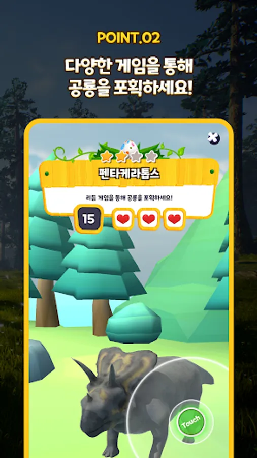- Capture dinosaurs with a timing game in which you throw dinosaur eggs at the augmented dinosaur at the correct timing to catch them, and a rhythm game in which you touch the target according to the music.