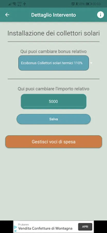 At this point, you can choose the interventions that interest you (for example, installation of a photovoltaic system, asbestos remediation or construction of the thermal coat), and indicate a cost estimate for that intervention. Don't worry if you don't already have a quote: Bonus Advisor will suggest the average price for each type of intervention!