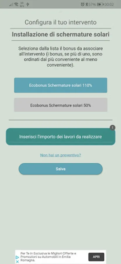 To begin, you will be asked questions, with multiple choice answers, to understand the type of building on which you want to carry out the work (single-family villa, apartment building, etc ...): based on your answers, you will be shown all the types of intervention you can carry out.