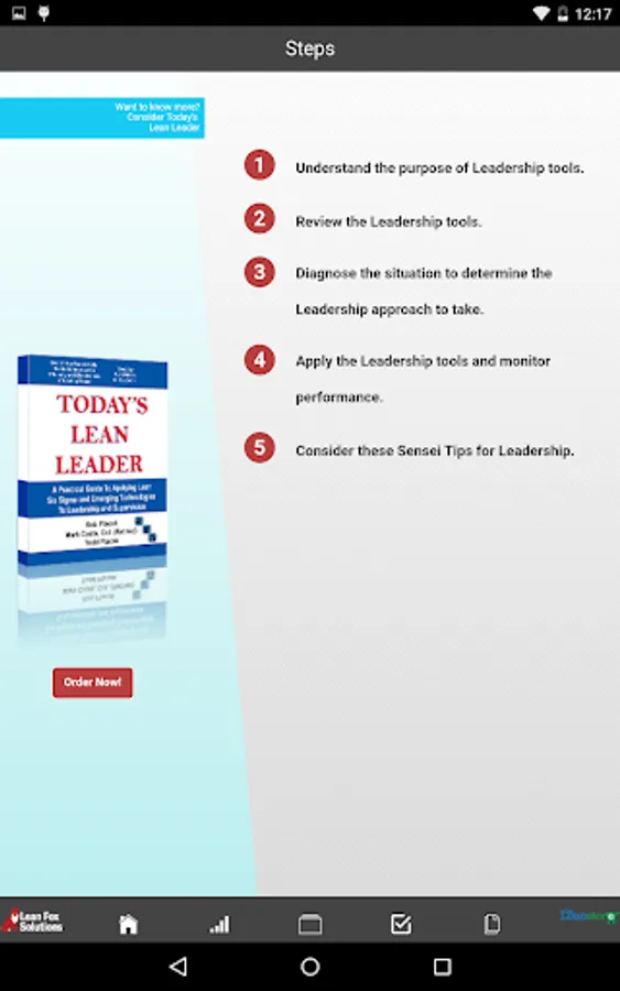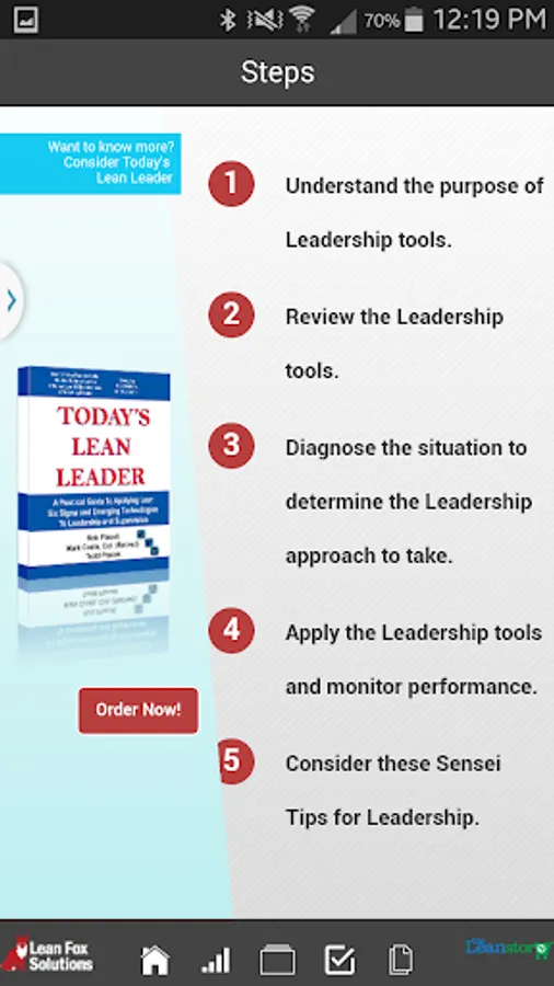 Learn three approaches to leadership, access over 20 leadership tools and solutions to Kaizen Event issues, access your solutions, and learn from the case studies. This app will explain the three main approaches to leadership, provide access to over 20 leadership tools and solutions to Kaizen Event issues, allow access to previous solutions as well as suggested Sensei solutions, and will provide informative case studies to learn from. This app will assist current and future leaders (managers, supervisors, team leads, etc.) with the savvy know how on when and where to use a particular leadership tool or approach when dealing with people issues during the course of an improvement project. This will help ensure all employees to be better engaged before, during, and after the Kaizen Event