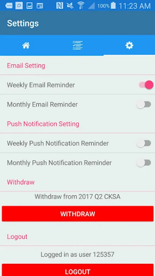 Settings page to select optional reminders or withdraw from the activity