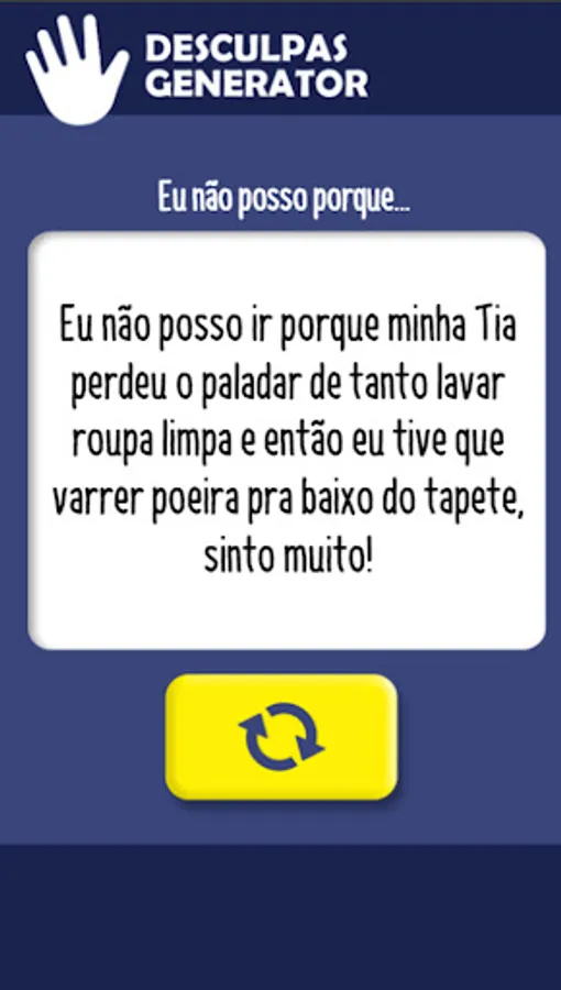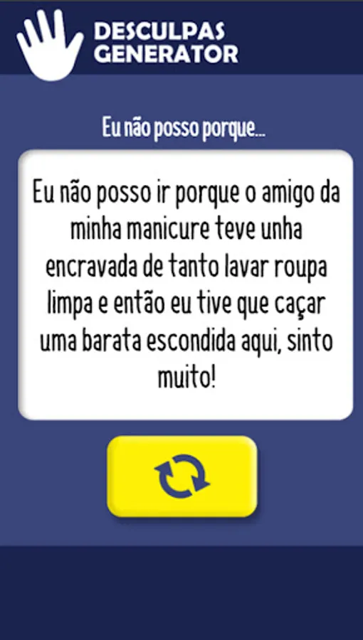 Looking for an original excuse not to go to the event you were invited to? your problems are over! With the Apology Generator you can instantly create a brand new apology every time you need it! Don't use the old excuses anymore and level up!