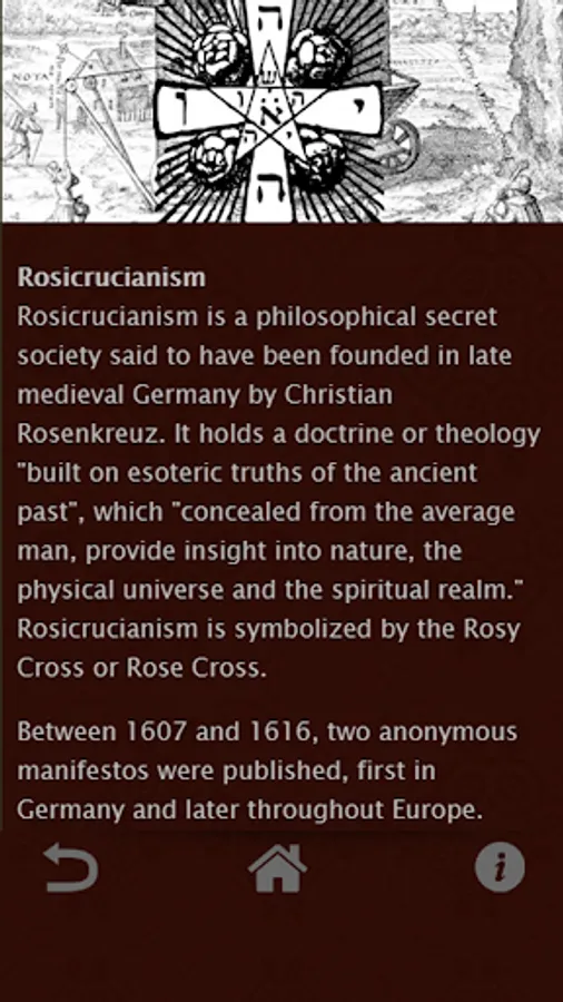 Rosicrucianism is a philosophical secret society said to have been founded in late medieval Germany by Christian Rosenkreuz. It holds a doctrine or theology "built on esoteric truths of the ancient past", which "concealed from the average man, provide insight into nature, the physical universe and the spiritual realm." Rosicrucianism is symbolized by the Rosy Cross or Rose Cross.