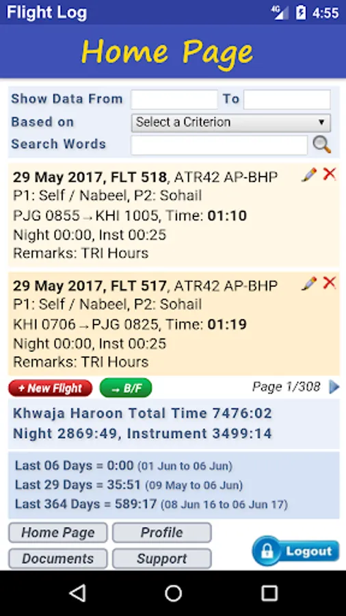 You can filter the records to display only those which you desire along with relevant totals. The procedure is simple, select the dates between which you want to search and then select a criterion and search words e.g. If you want that only flights between 1st Jan and 30th Jan are shown and only those flights which are flown out of a particular airport, then select "From" and "TO" dates, criterion "Dep Airport" and in search words enter the airport name you are looking for like "EGLL" or whatever you entered in your log. In case you just want to display data between two dates, you dont need to enter any search words.
