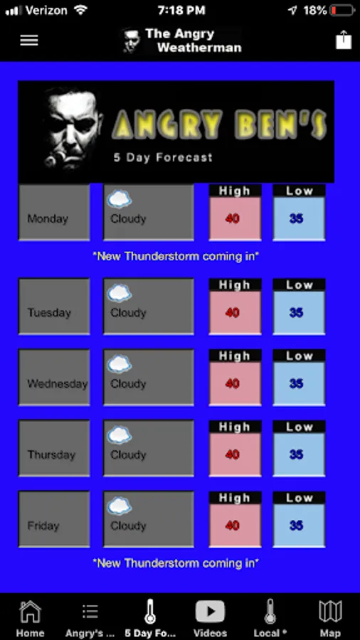 - Access to Angry Ben's 5 day forecast. Aside from the automated 5 day forecast on the "Local" tab, there is a dedicated, hand-made, 5 day for the New York City Metro Area, updated daily to reflect any changes that may arise. Within the 5 day, it is noted if there will be any localized differences, such as cooler temps at the shore during the summer.