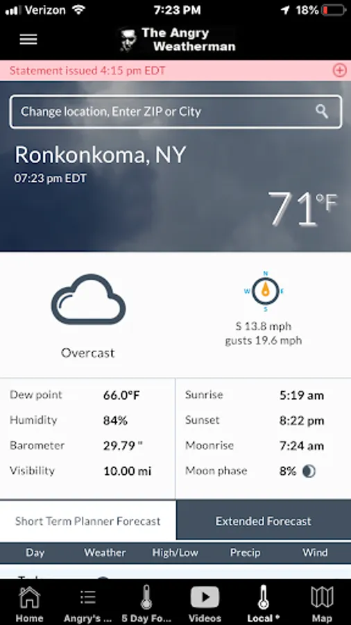 - In the "local" tab, you can choose for your phone to have access to your location. This will put you to the nearest weather observation station anywhere in the United States; giving you the current temperature, wind, dew point, humidity, and current conditions. You also have access to a more generalized and automated 5 day forecast, making things convenient when traveling, relocating, or if you live outside of the NYC Metro Area.