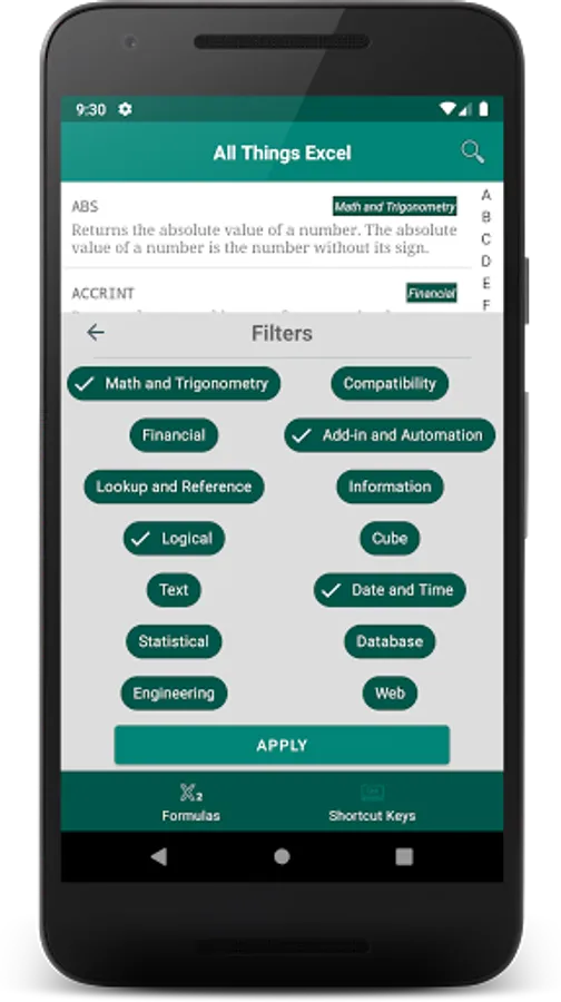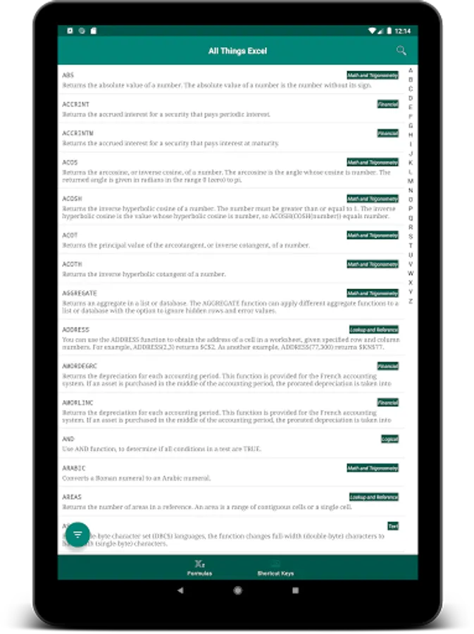 MS-Excel has many functions and formulas divided into many categories and they are Financial, Math and Trigonometry, Logical, Date and Time, Compatibility, Lookup and Reference, Information, Add-in and Automation, Text, Engineering, Database, Statistical and Web. All Things Excel lists lets you filter according to these categories. Most of these functions and formulas match with Google Sheets too.