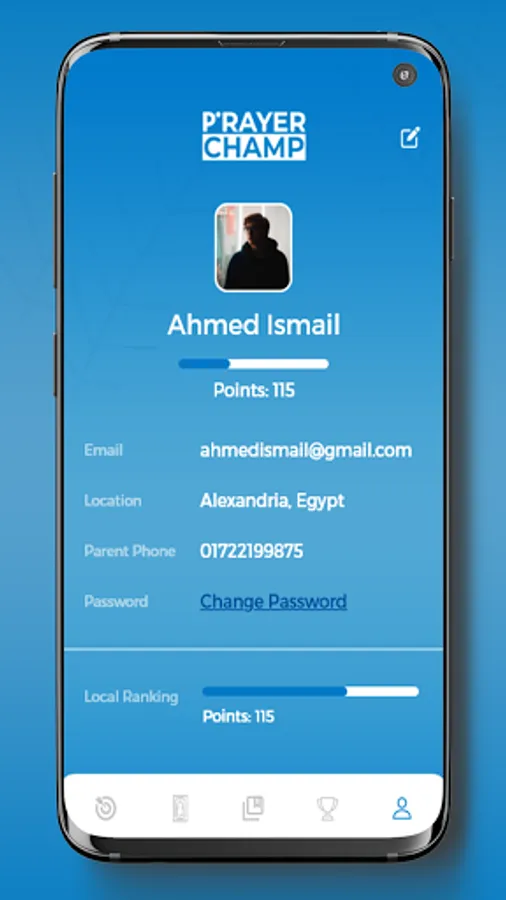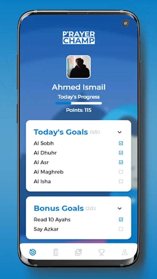 Prayer Champ is an all-around Islamic app that encourages the youth to keep up with their daily prayers in a modern and fun environment. Daily goals and tasks are assigned regularly to each user which are added to the user's points upon completion. Users can track their points and compete with their friends to reach the highest scores and the top leaderboard leaders are awarded various prizes.