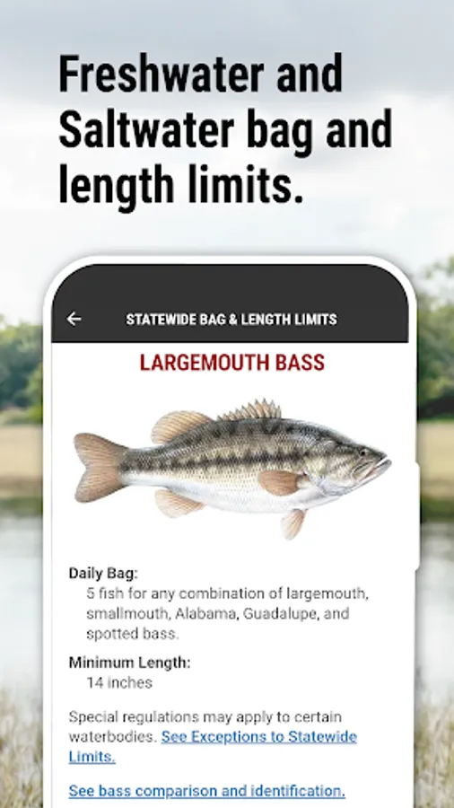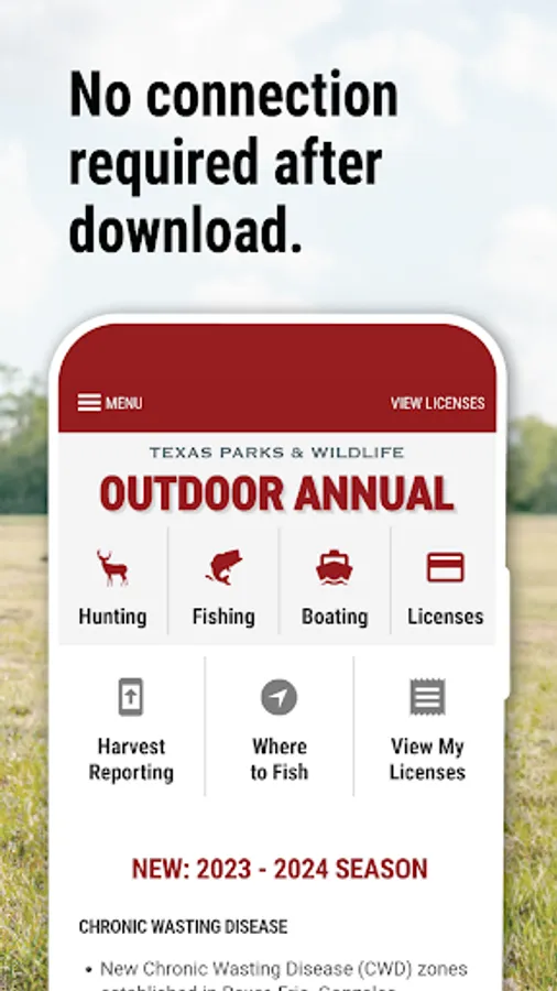 Access the official Texas Hunting and Fishing Regulations summary from Texas Parks and Wildlife… without internet connection.* Get the information you need when you are afield or afloat!