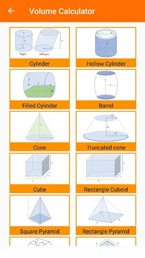 7. Volume Calculator ( Cylinder , Hollow Cylinder, Barrel, Cone, Truncated Cone, Sphere, Spherical cap, Spherical segment, Spherical slice, Ellipsoid ,Torus etc..)