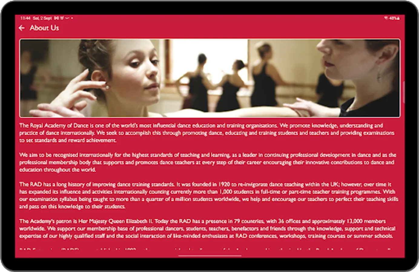 The Royal Academy of Dance is one of the world’s most influential dance education and training organisations with over 13,000 members worldwide and a presence in 70+ countries. We promote knowledge, understanding and practice of dance internationally. The RAD delivers a number of national and international competitions, bursaries, scholarships and community events such as the world renowned Genée International Ballet Competition. Every year, approximately 230,000 candidates enter for RAD Examinations, Presentation and Demonstration Classes, Class Awards, and Solo Performance Awards.