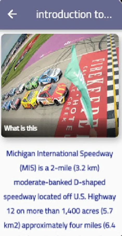 Michigan International Speedway (MIS) is a 2-mile (3.2 km) moderate-banked D-shaped speedway located off U.S. Highway 12 on more than 1,400 acres (5.7 km2) approximately four miles (6.4 km) south of the village of Brooklyn, in the scenic Irish Hills area of southeastern Michigan, as shown in the application how michigan international.