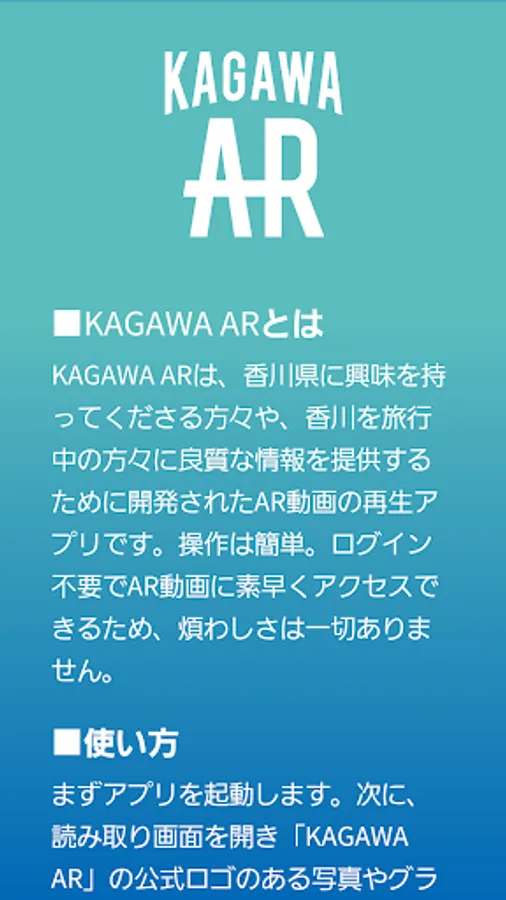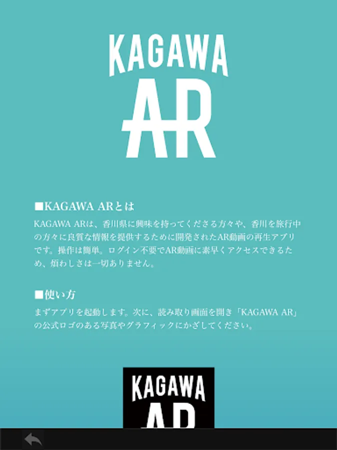 KagawaARは香川県に興味を持ってくださる方や、香川県を旅行中の方に良質な情報を提供するために開発されたAR動画の再生アプリです。操作は簡単です。ログイン不要でAR画面に素早くアクセスでき、マーカーを付けている写真に稼働したカメラをスキャンするだけで動画が再生されます。