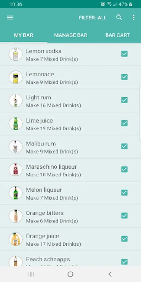 "Manage Bar": These are all the ingredients in Bartender! Tap the checkbox beside an item to add or remove it from your bar!