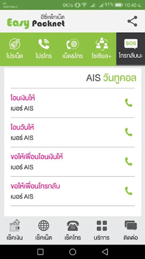 5. SOS: Emergency money runs out. For AIS One 2 Call customers, we can ask friends to call back. Or can transfer money (3 baht service fee) or we can transfer money or transfer dates to AIS friends together as well