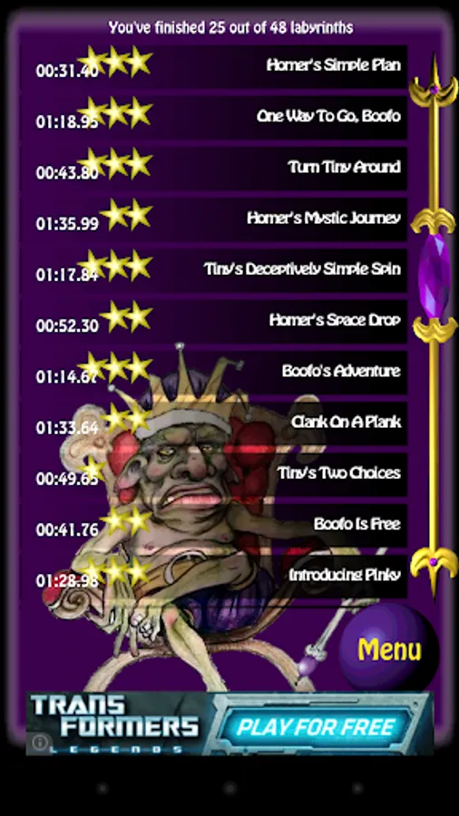 Roll your way to victory over each maze by avoiding the traps set for you by The Goblin King. You'll win an avalanche of golden stars by being fast, brave and by avoiding mistakes.