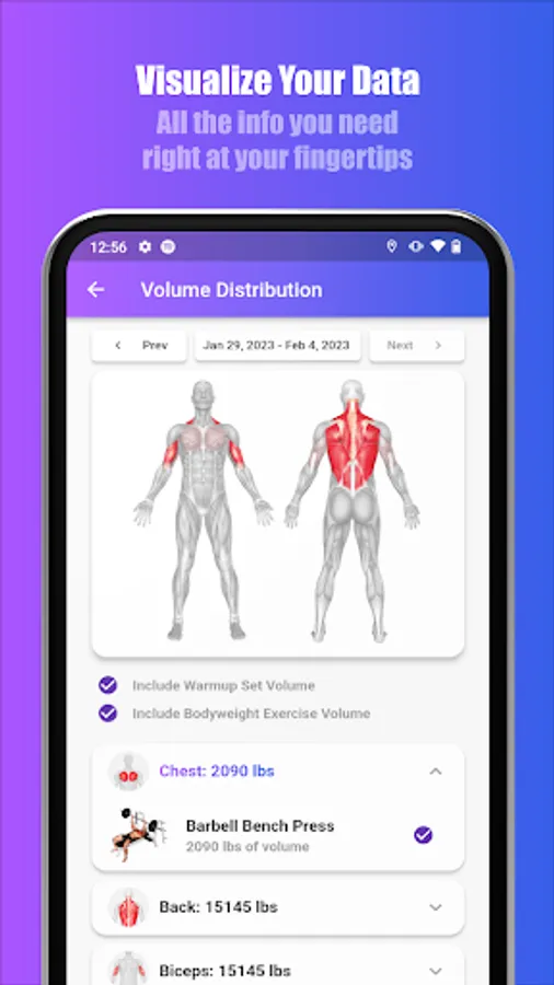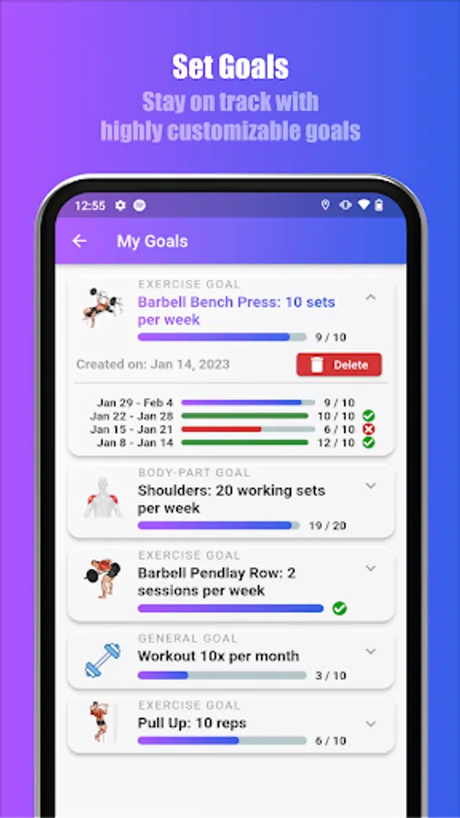 - Create highly customizable goals for workout frequency, exercise variation, muscle group volume, exercise volume, strength, and more!