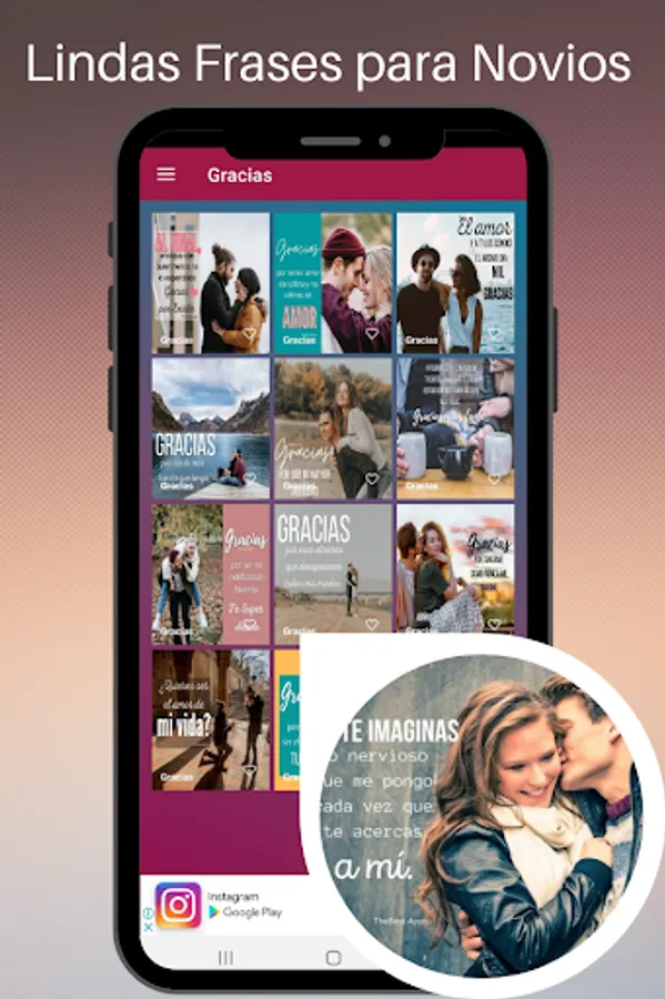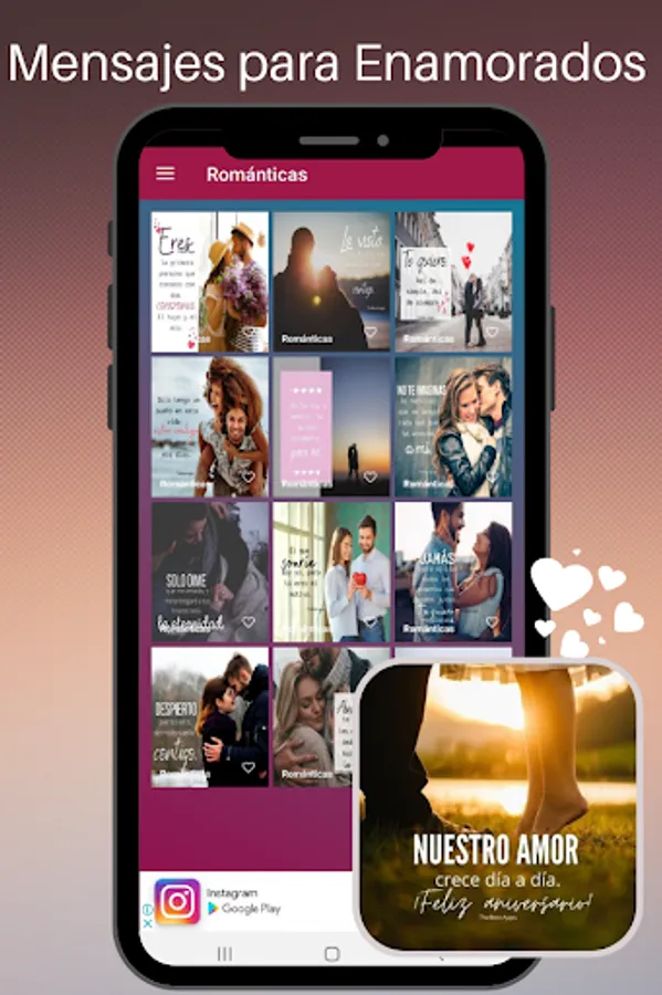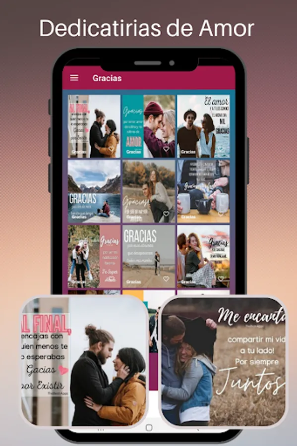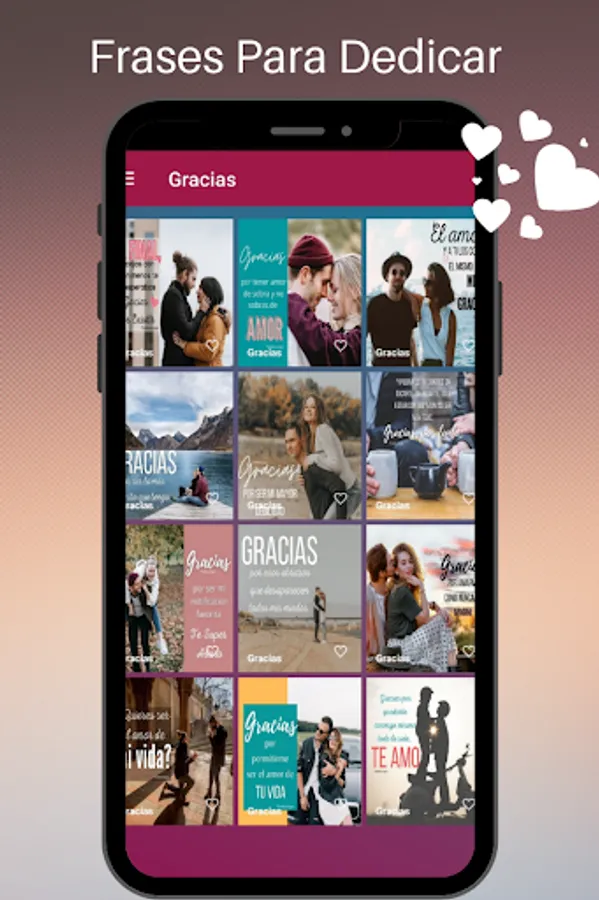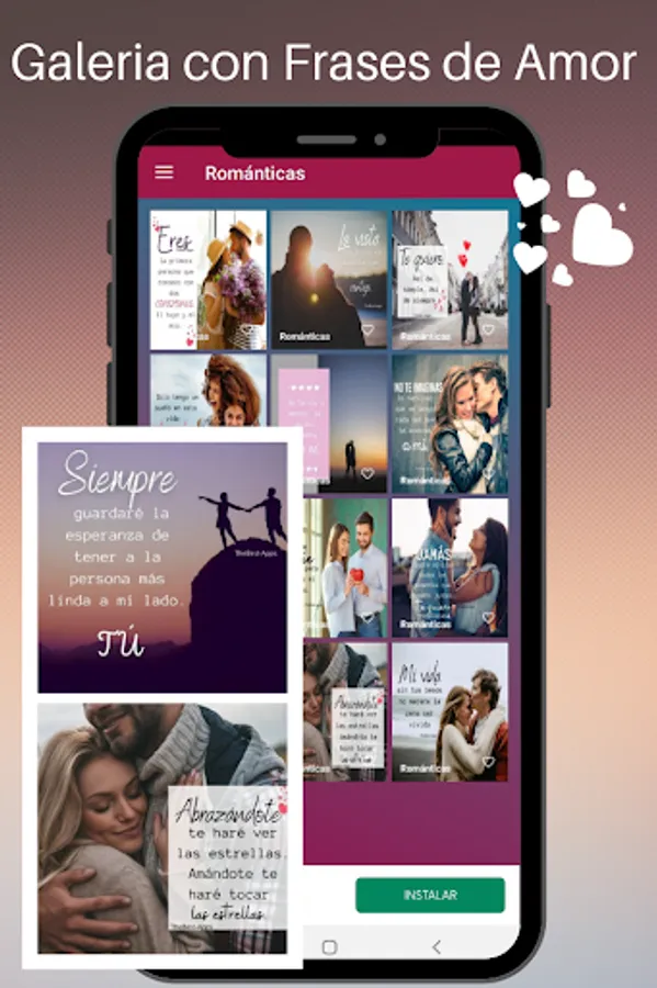 Some people have difficulty putting their feelings into words, so the design of our app makes it easy for the user to share a gallery with beautiful Romantic messages, which allows them to choose the phrase of their choice according to the occasion or theme, for example: we have phrases of love for my boyfriend or girlfriend, phrases of love from a distance, phrases for husbands or simply phrases of love to fall in love.
