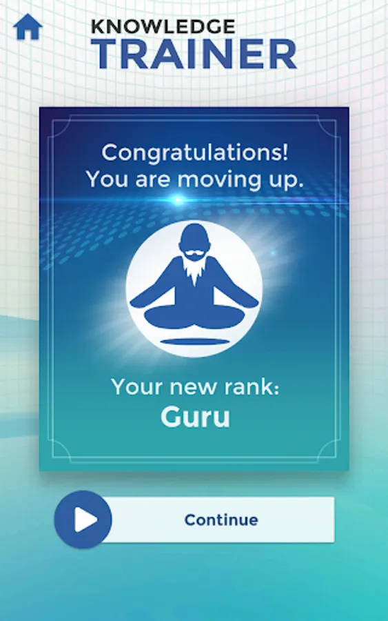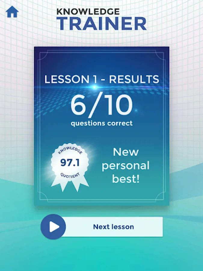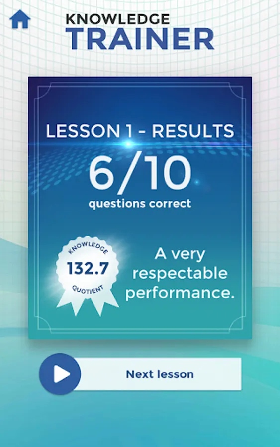 Each trivia lesson tests your wits with 10 questions from 10 different categories. The difficulty level depends on you: get an answer right, you'll move up a level. A wrong answer leads to an easier question. But you'll want to move up to improve your Knowledge Quotient, recalculated after every round.