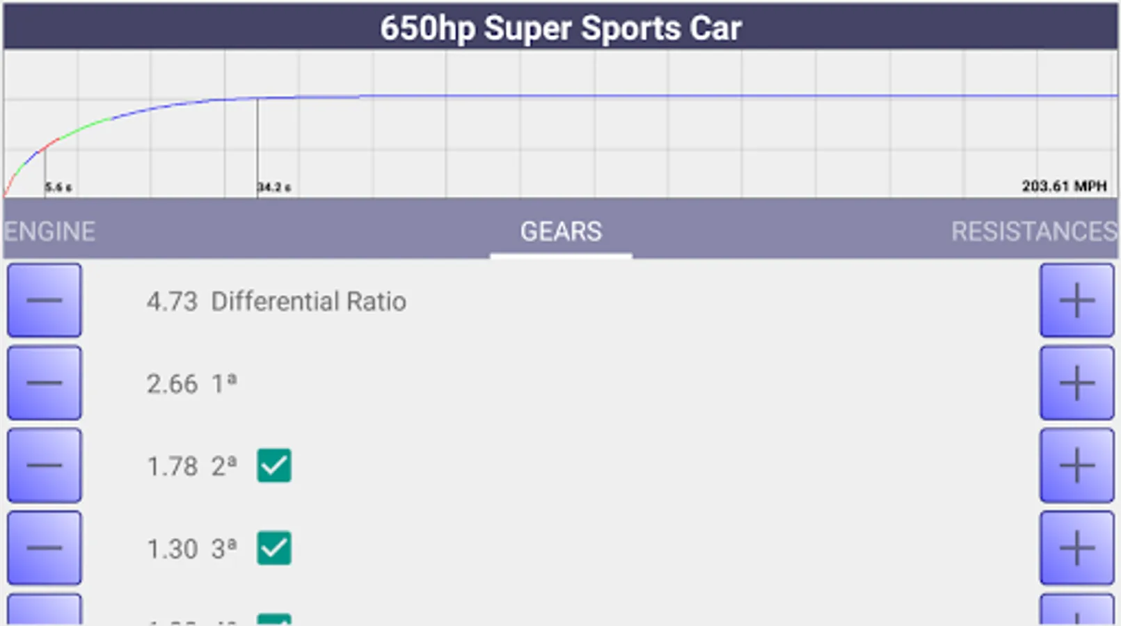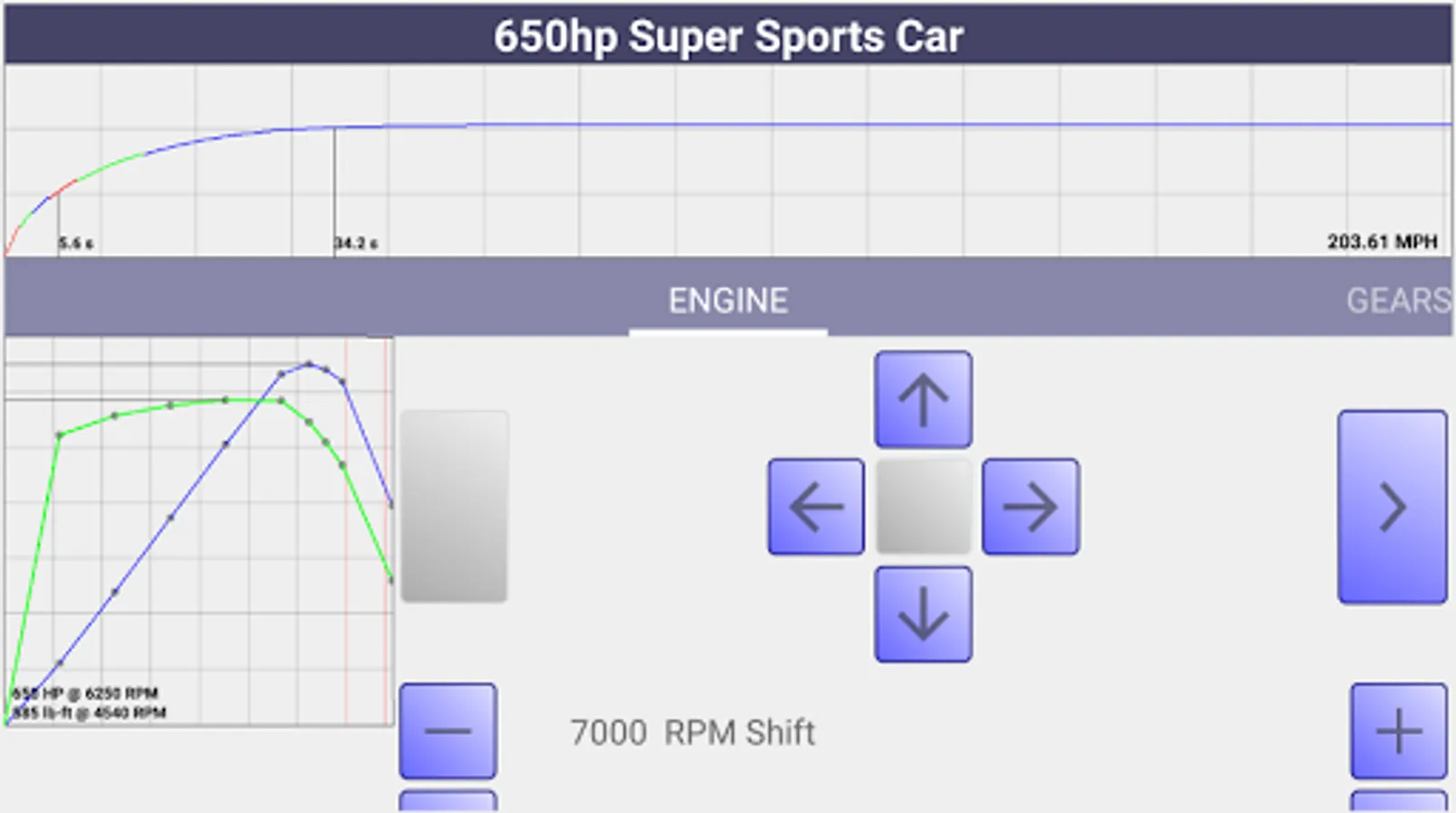 MotorSim allows you to configure a number of vehicle parameters to calculate what the resulting performance will be. It includes an interactive simulator with speedometer, rpm meter, throttle, brake and gear shift (manual or auto), with procedurally generated engine sound (not by sampling) an a representation of vehicle position over a 1/4 mile road segment. Once a setting has been tested, the user can save a ghost/shadow in order to later compare this setting performance with some other.